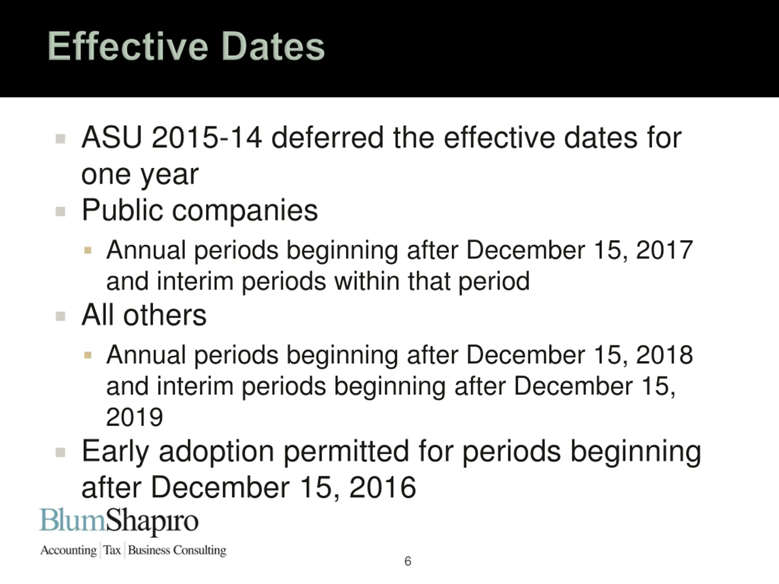 ASU 2015-14 deferred the effective dates for one year Public companies Annual periods beginning after December 15, 2017 and interim periods within that period All others Annual periods beginning after December 15, 2018 and interim periods beginning after December 15, 2019 Early adoption permitted for periods beginning after December 15, 2016 6
