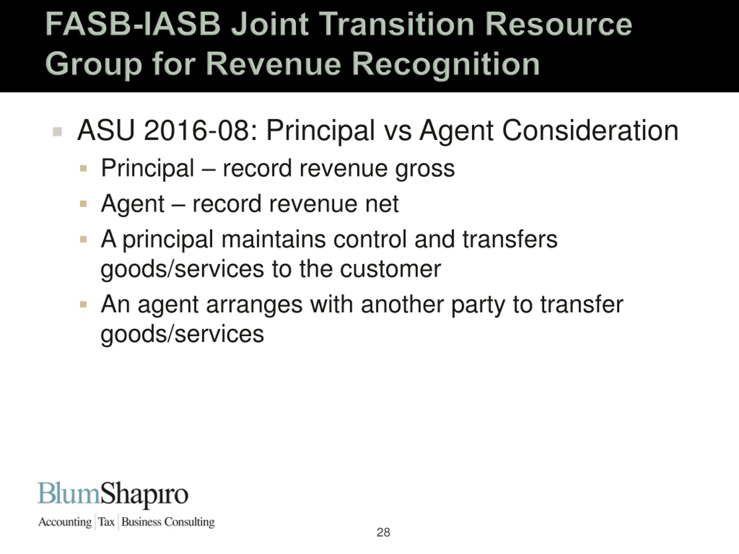 ASU 2016-08: Principal vs Agent Consideration Principal record revenue gross Agent record revenue net A principal maintains control and transfers goods/services to the customer An agent arranges with another party to transfer goods/services 28