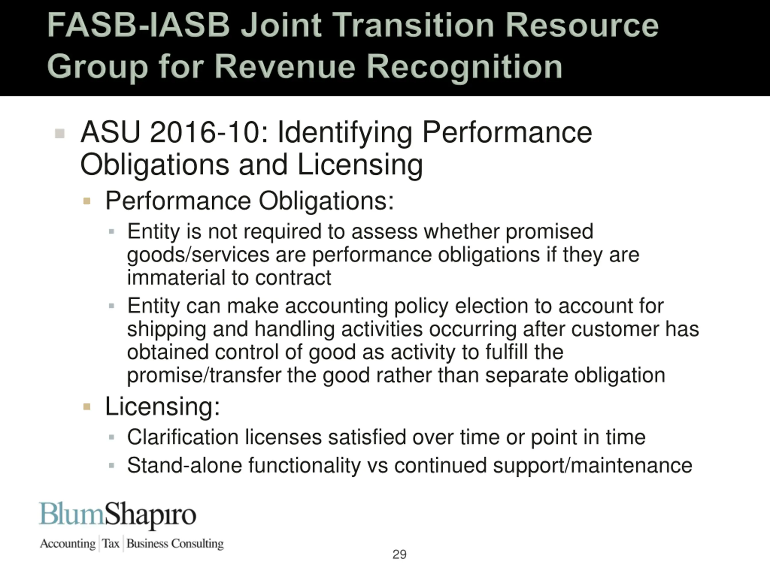 ASU 2016-10: Identifying Performance Obligations and Licensing Performance Obligations: Entity is not required to assess whether promised goods/services are performance obligations if they are immaterial to contract Entity can make accounting policy election to account for shipping and handling activities occurring after customer has obtained control of good as activity to fulfill the promise/transfer the good rather than separate obligation Licensing: Clarification licenses satisfied over time or point in time Stand-alone functionality vs continued support/maintenance 29