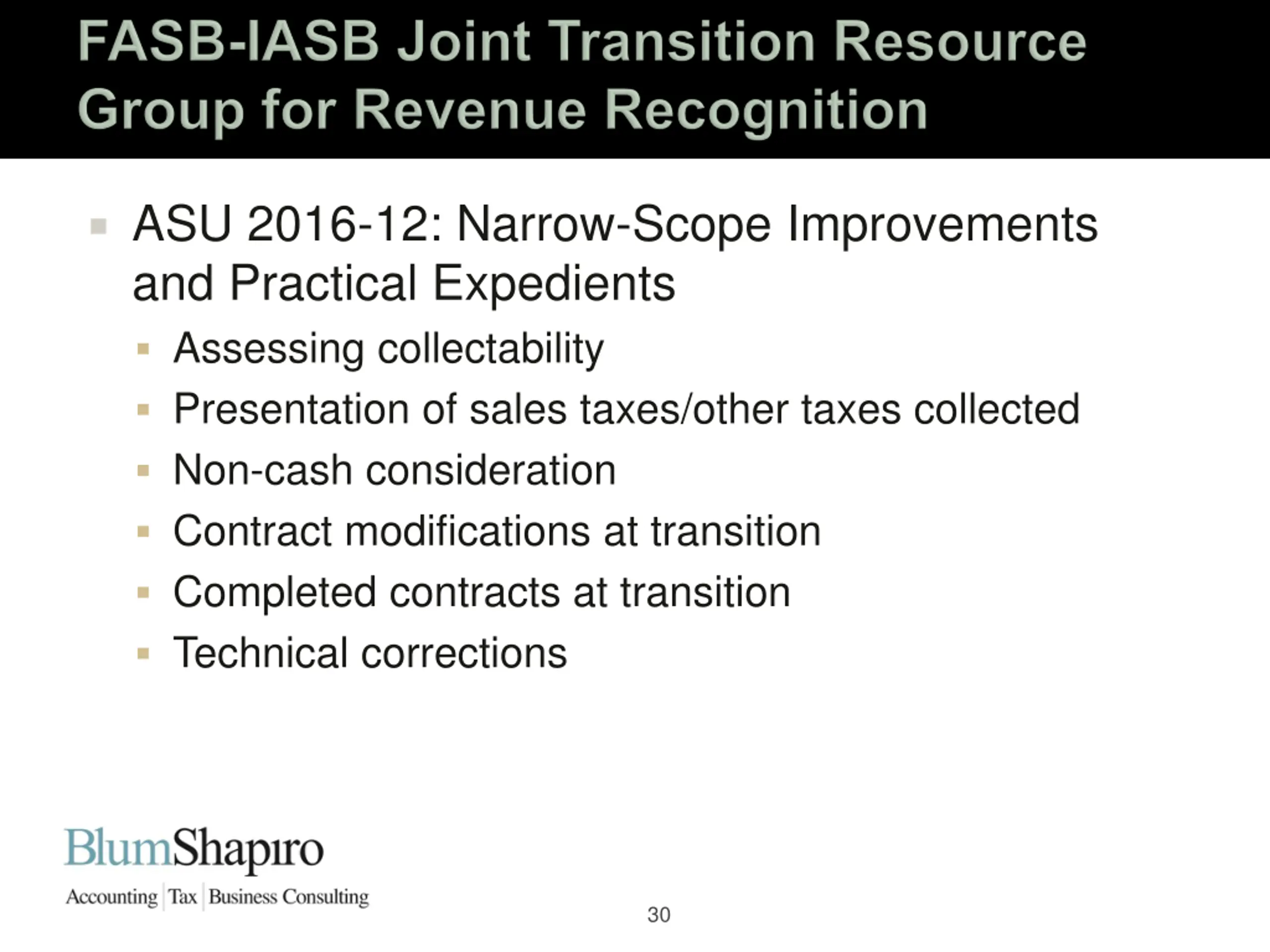 ASU 2016-12: Narrow-Scope Improvements and Practical Expedients Assessing collectability Presentation of sales taxes/other taxes collected Non-cash consideration Contract modifications at transition Completed contracts at transition Technical corrections 30