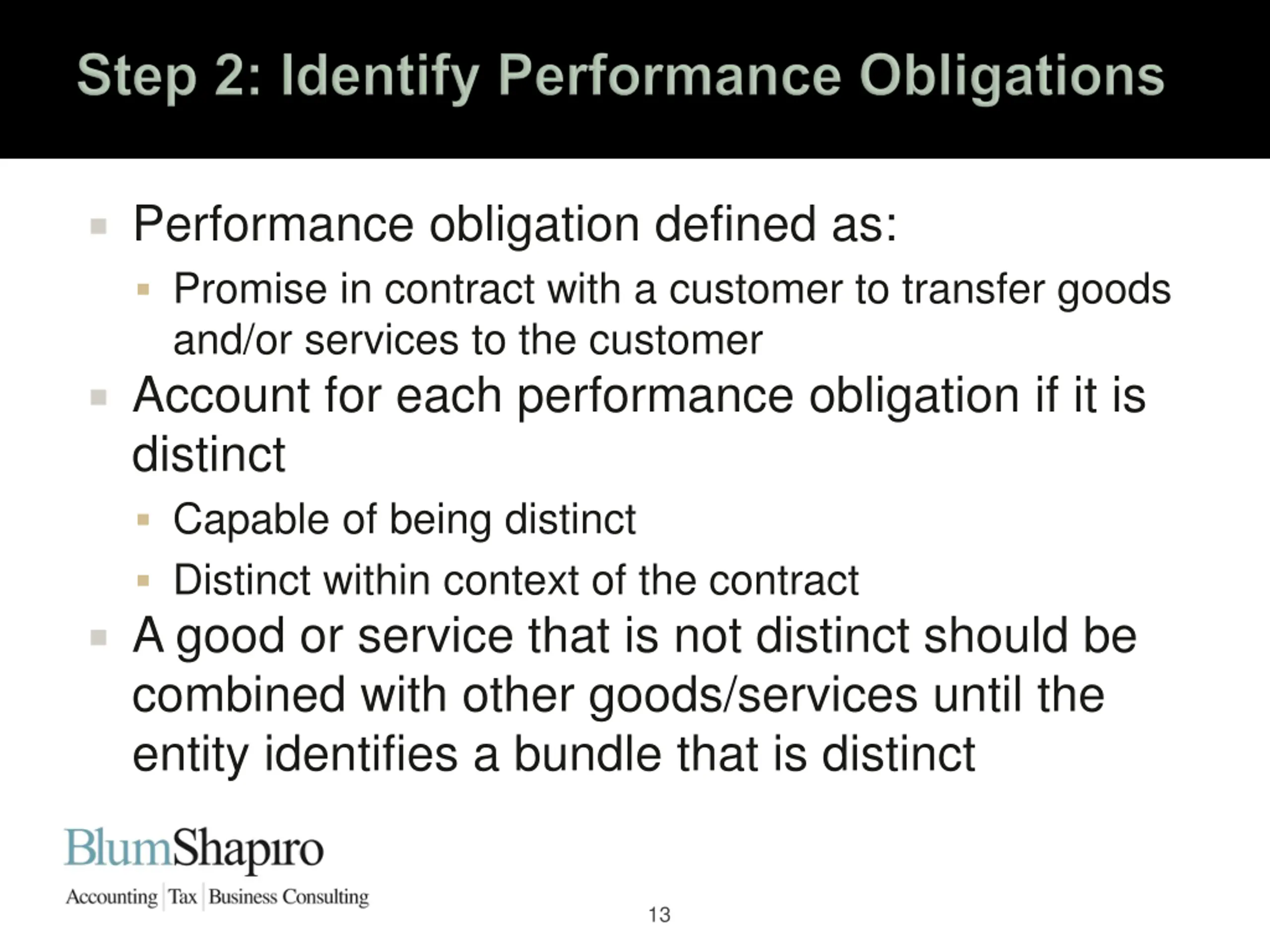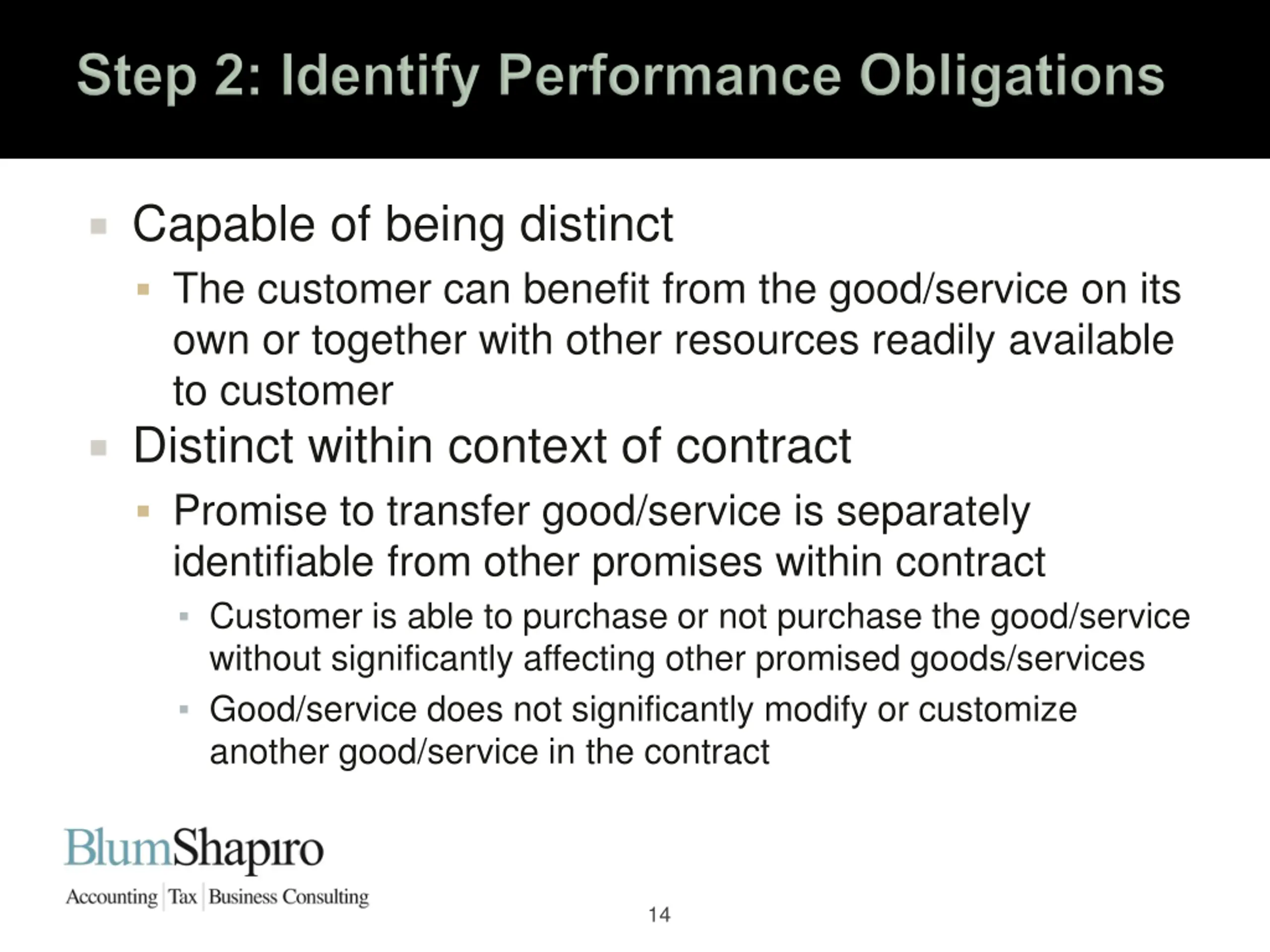 Performance obligation defined as: Promise in contract with a customer to transfer goods and/or services to the customer Account for each performance obligation if it is distinct Capable of being distinct Distinct within context of the contract A good or service that is not distinct should be combined with other goods/services until the entity identifies a bundle that is distinct 13