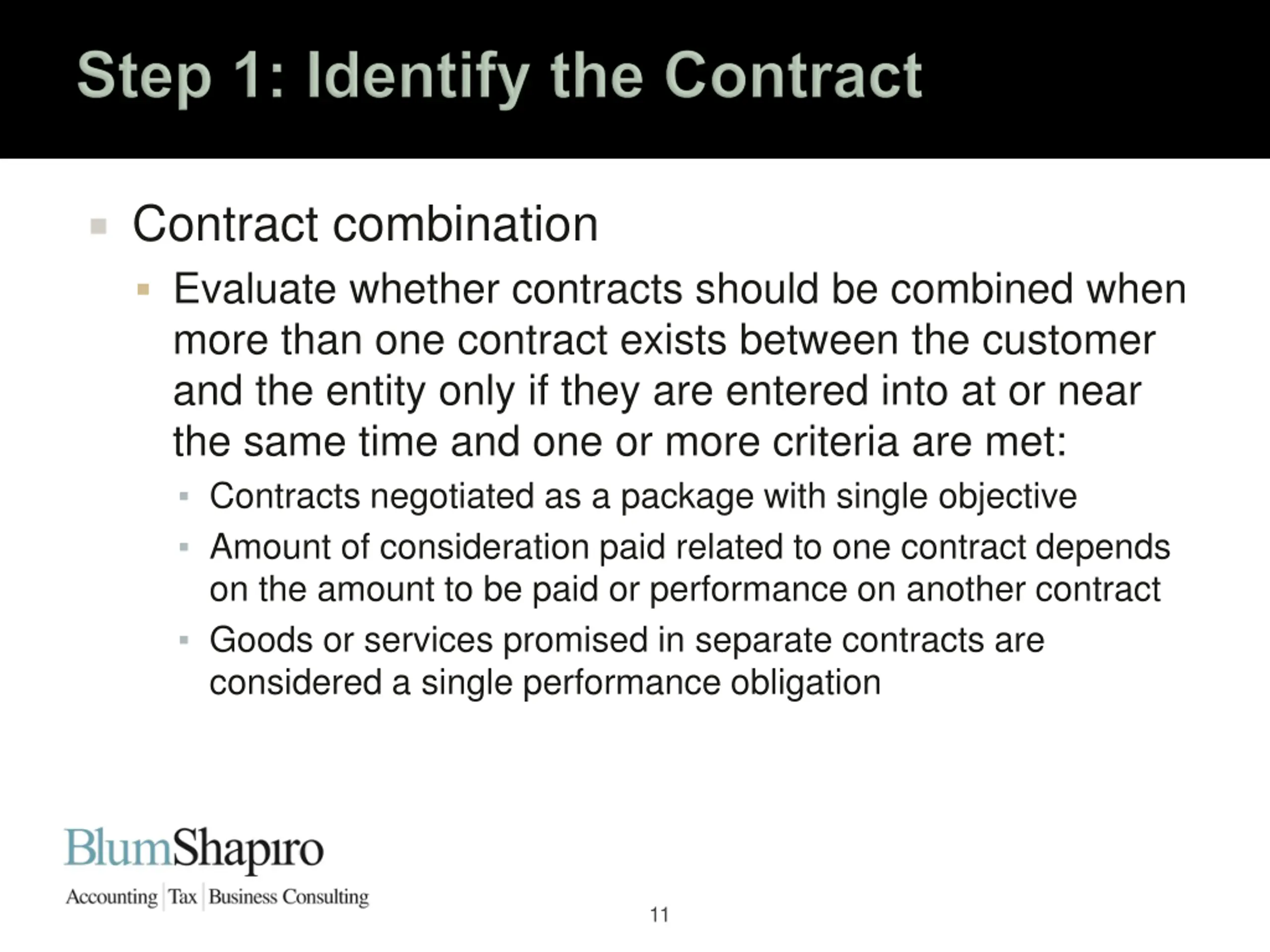 Contract combination Evaluate whether contracts should be combined when more than one contract exists between the customer and the entity only if they are entered into at or near the same time and one or more criteria are met: Contracts negotiated as a package with single objective Amount of consideration paid related to one contract depends on the amount to be paid or performance on another contract Goods or services promised in separate contracts are considered a single performance obligation 11