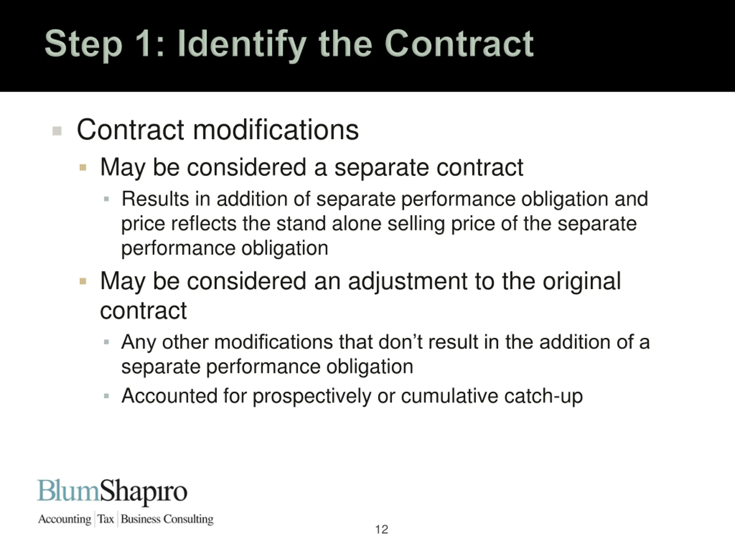 Contract modifications May be considered a separate contract Results in addition of separate performance obligation and price reflects the stand alone selling price of the separate performance obligation May be considered an adjustment to the original contract Any other modifications that don t result in the addition of a separate performance obligation Accounted for prospectively or cumulative catch-up 12