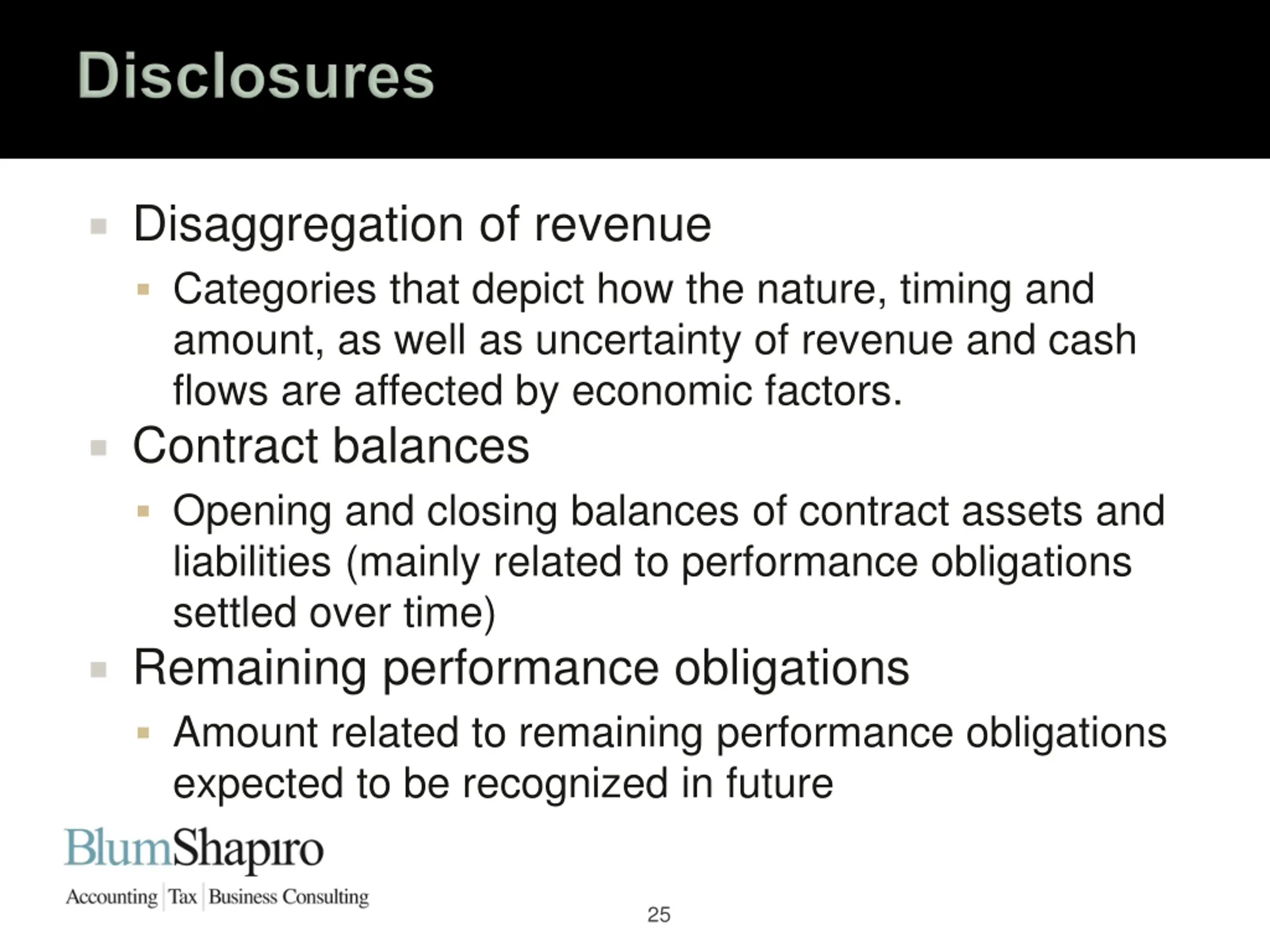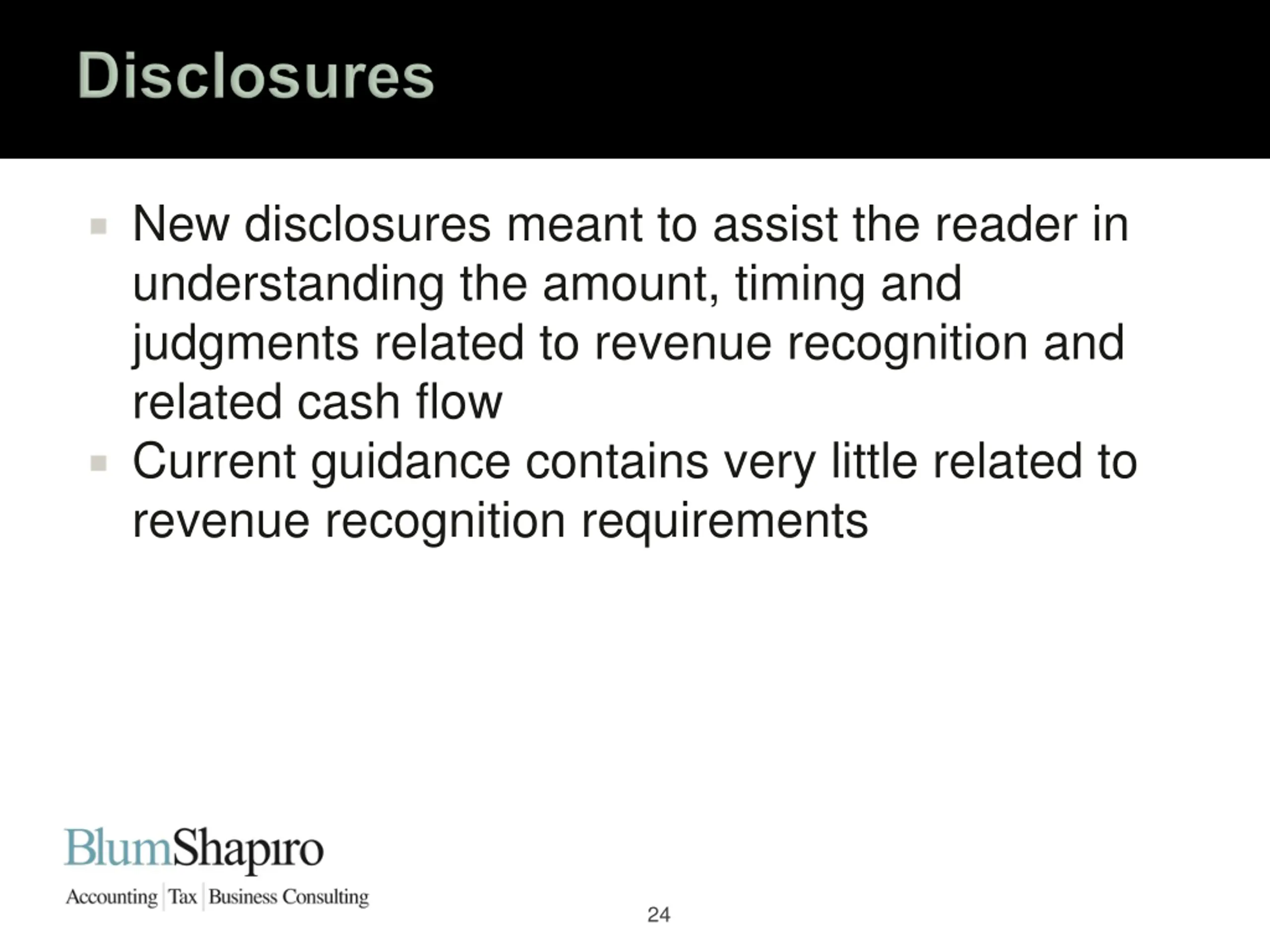 New disclosures meant to assist the reader in understanding the amount, timing and judgments related to revenue recognition and related cash flow Current guidance contains very little related to revenue recognition requirements 24