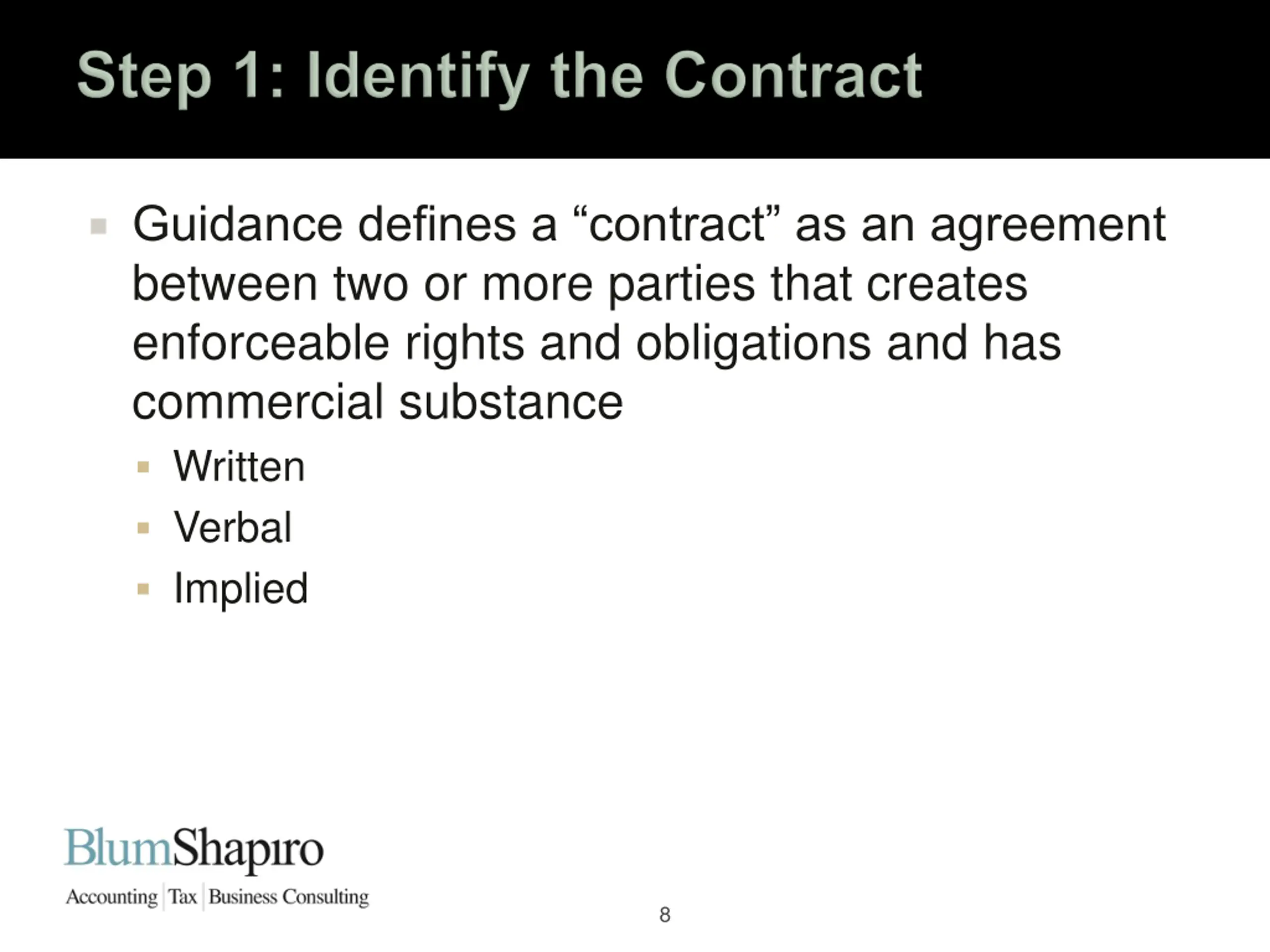 Guidance defines a contract as an agreement between two or more parties that creates enforceable rights and obligations and has commercial substance Written Verbal Implied 8