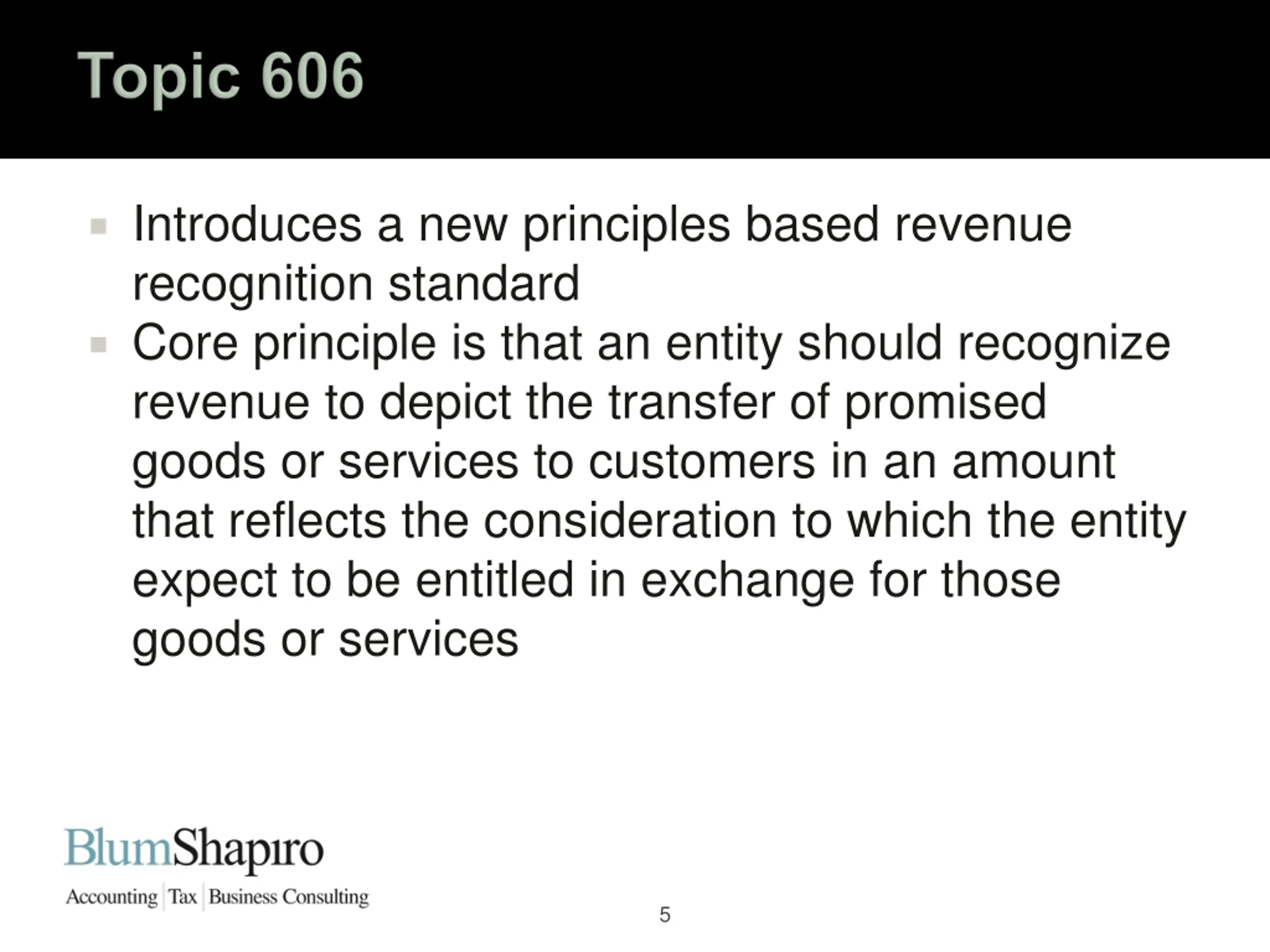 Introduces a new principles based revenue recognition standard Core principle is that an entity should recognize revenue to depict the transfer of promised goods or services to customers in an amount that reflects the consideration to which the entity expect to be entitled in exchange for those goods or services 5