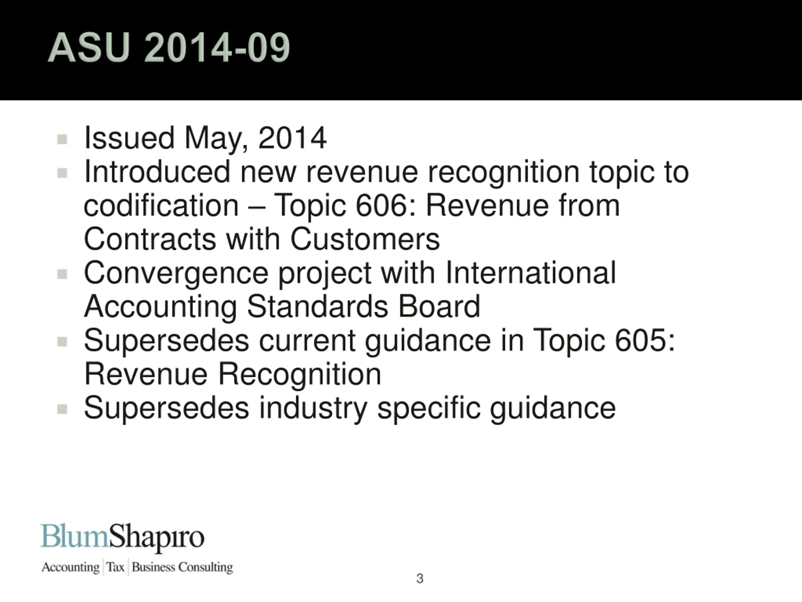 Issued May, 2014 Introduced new revenue recognition topic to codification Topic 606: Revenue from Contracts with Customers Convergence project with International Accounting Standards Board Supersedes current guidance in Topic 605: Revenue Recognition Supersedes industry specific guidance 3