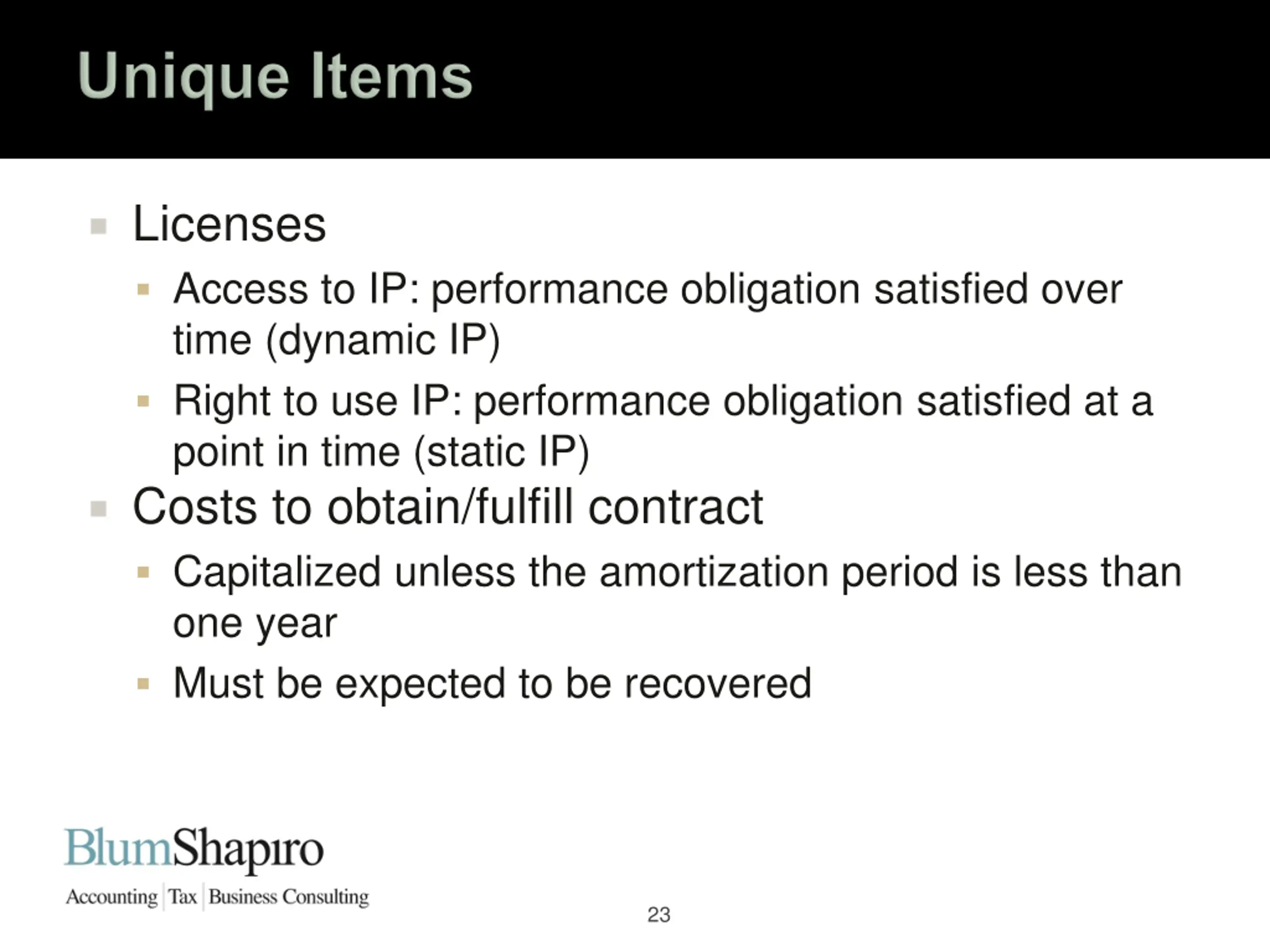 Licenses Access to IP: performance obligation satisfied over time (dynamic IP) Right to use IP: performance obligation satisfied at a point in time (static IP) Costs to obtain/fulfill contract Capitalized unless the amortization period is less than one year Must be expected to be recovered 23