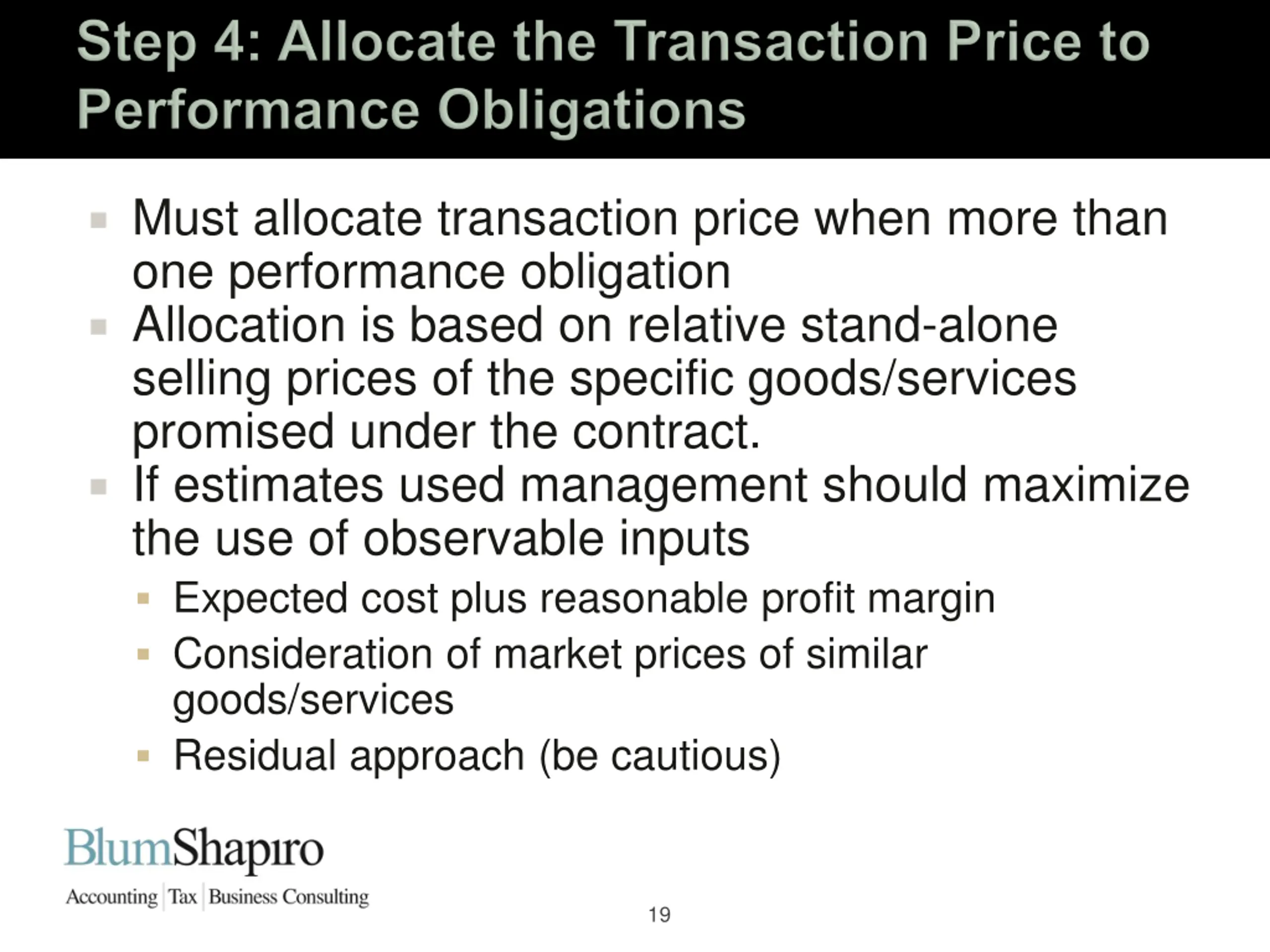 Must allocate transaction price when more than one performance obligation Allocation is based on relative stand-alone selling prices of the specific goods/services promised under the contract. If estimates used management should maximize the use of observable inputs Expected cost plus reasonable profit margin Consideration of market prices of similar goods/services Residual approach (be cautious) 19