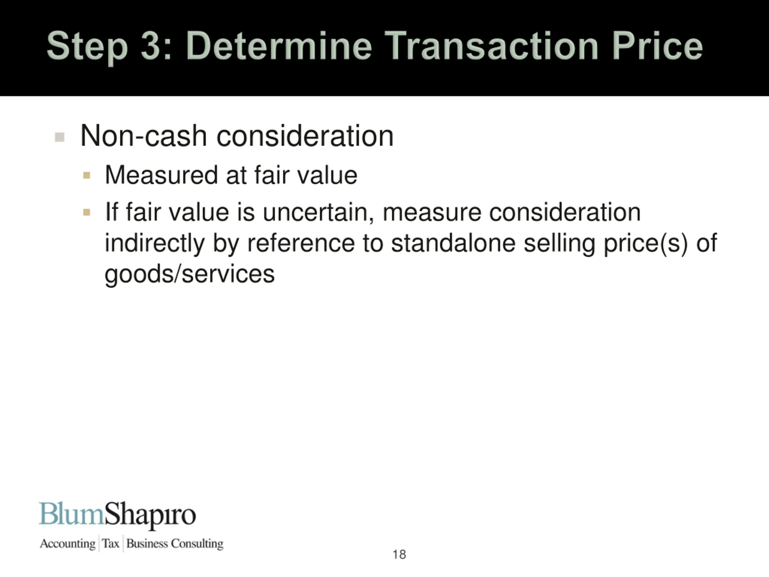 Non-cash consideration Measured at fair value If fair value is uncertain, measure consideration indirectly by reference to standalone selling price(s) of goods/services 18