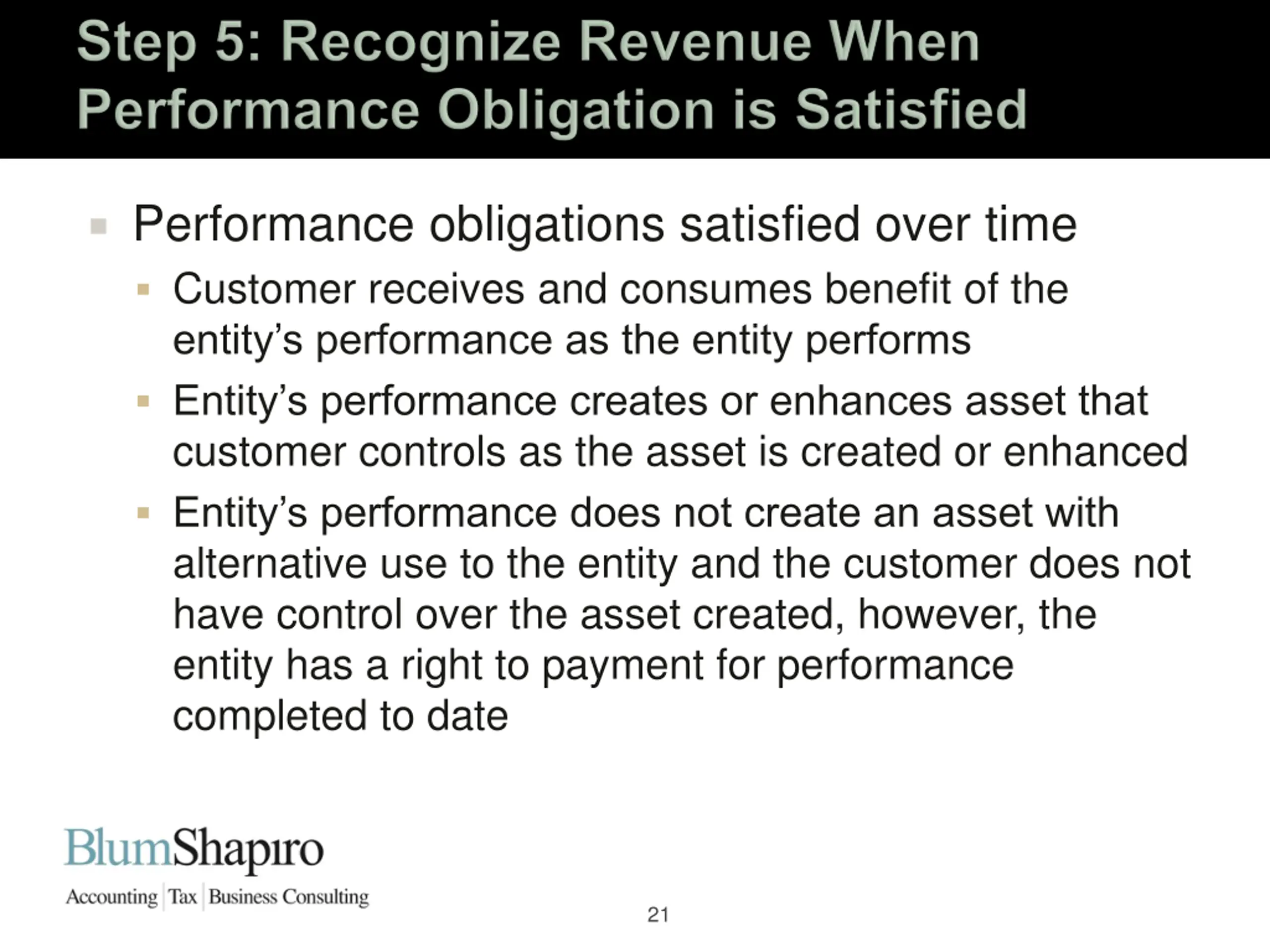 Performance obligations satisfied over time Customer receives and consumes benefit of the entity s performance as the entity performs Entity s performance creates or enhances asset that customer controls as the asset is created or enhanced Entity s performance does not create an asset with alternative use to the entity and the customer does not have control over the asset created, however, the entity has a right to payment for performance completed to date 21