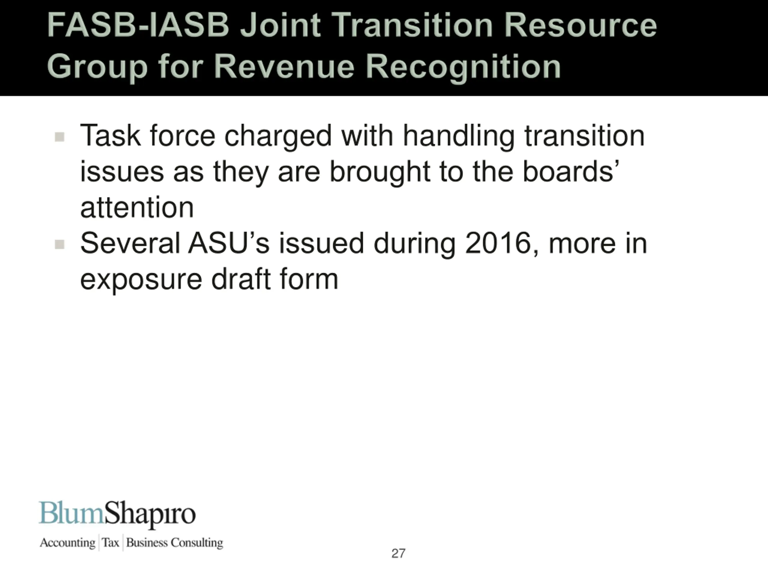 Task force charged with handling transition issues as they are brought to the boards attention Several ASU s issued during 2016, more in exposure draft form 27