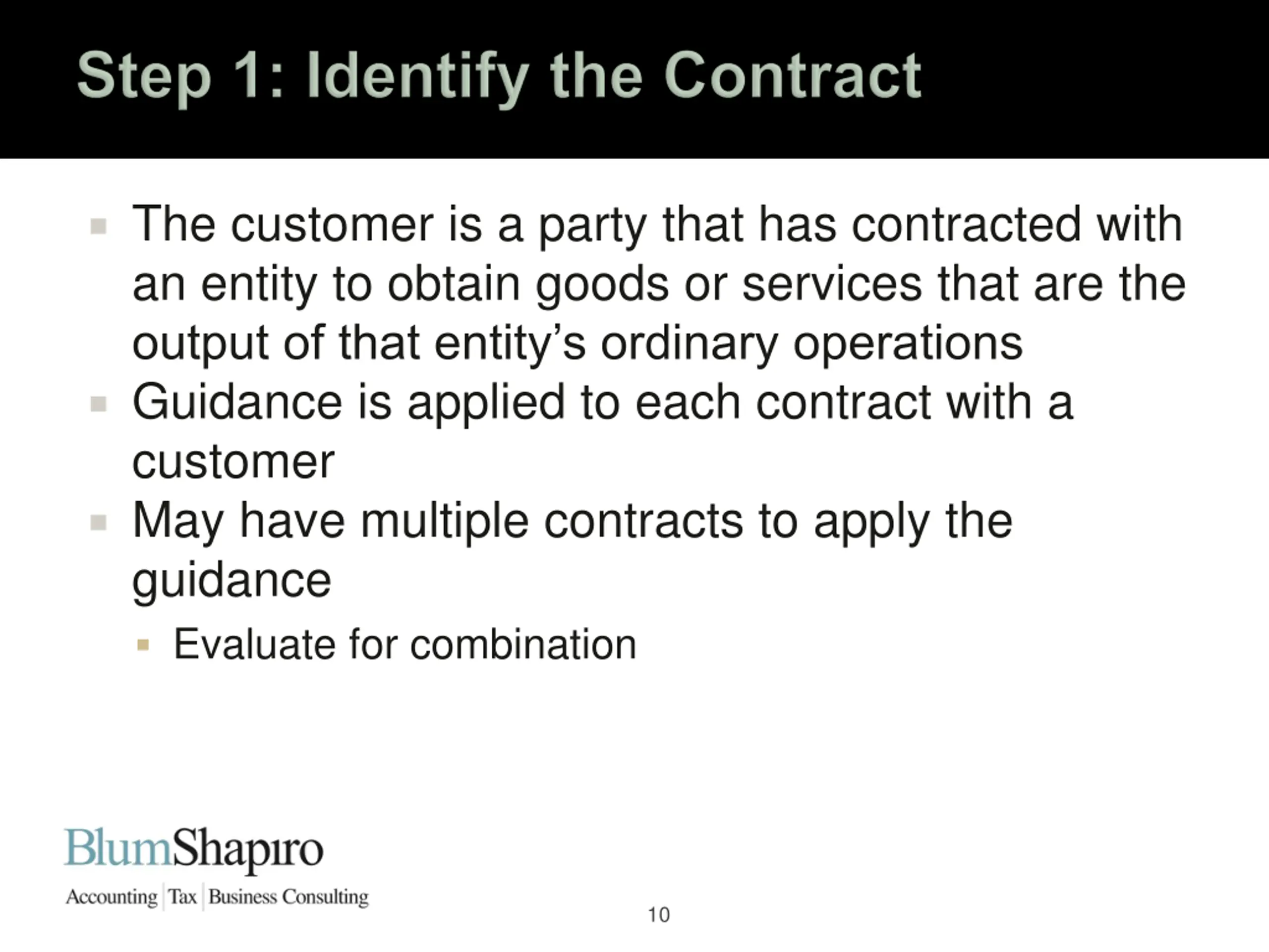 The customer is a party that has contracted with an entity to obtain goods or services that are the output of that entity s ordinary operations Guidance is applied to each contract with a customer May have multiple contracts to apply the guidance Evaluate for combination 10