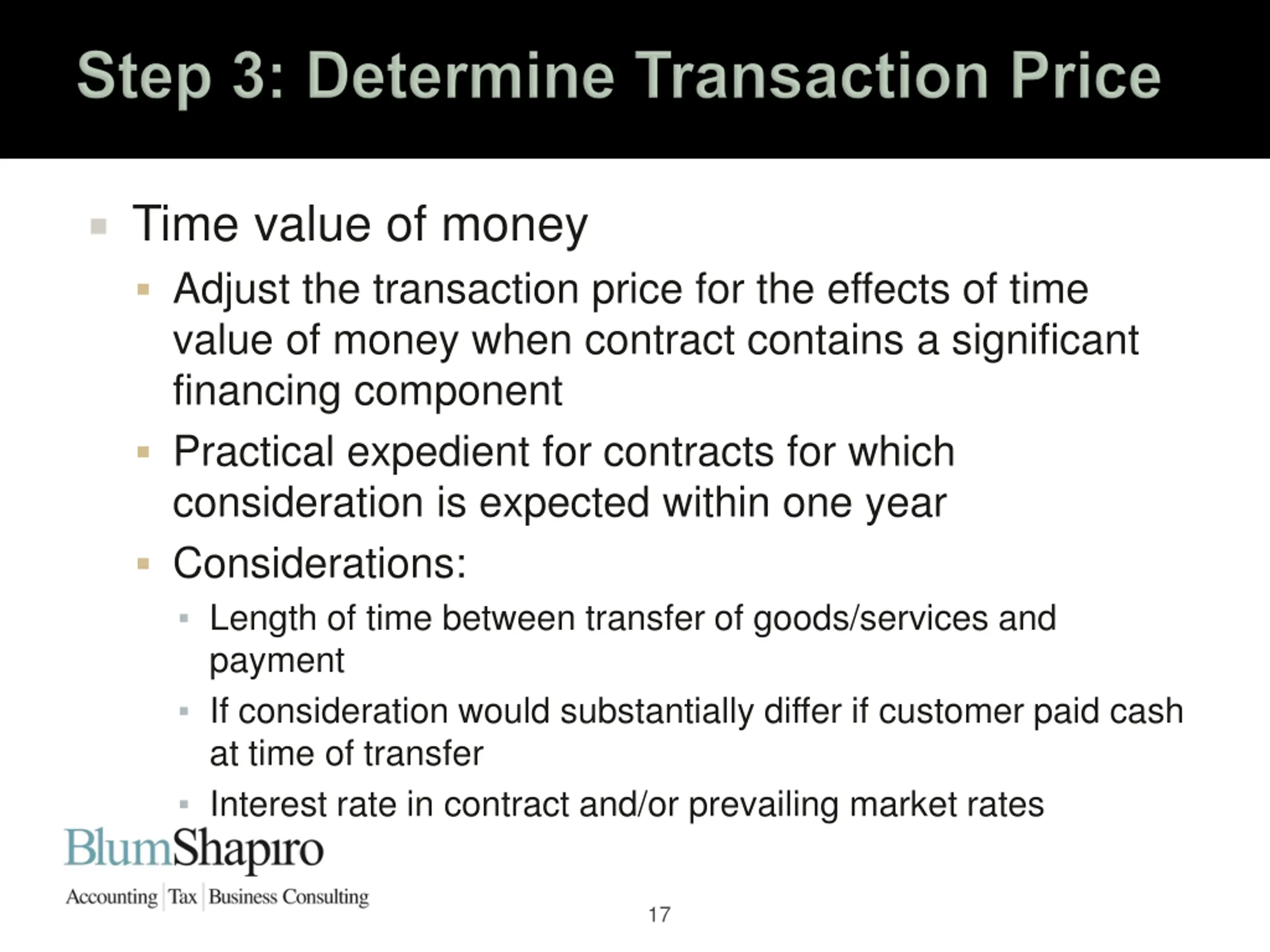 Time value of money Adjust the transaction price for the effects of time value of money when contract contains a significant financing component Practical expedient for contracts for which consideration is expected within one year Considerations: Length of time between transfer of goods/services and payment If consideration would substantially differ if customer paid cash at time of transfer Interest rate in contract and/or prevailing market rates 17