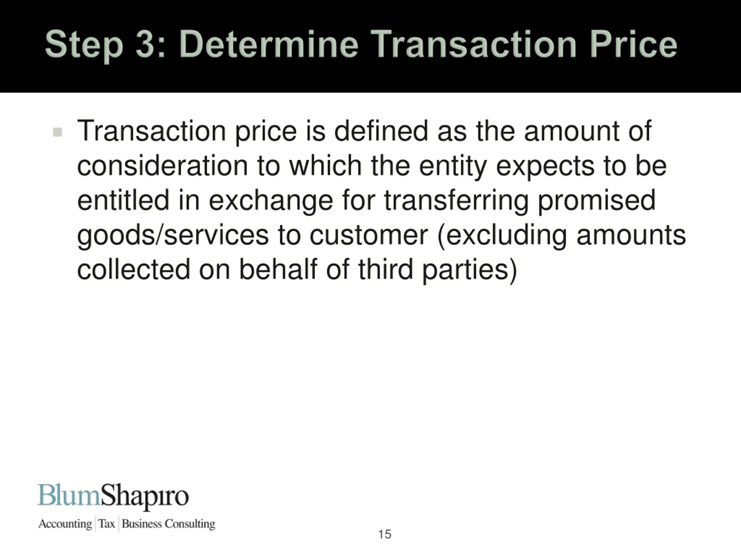 Transaction price is defined as the amount of consideration to which the entity expects to be entitled in exchange for transferring promised goods/services to customer (excluding amounts collected on behalf of third parties) 15
