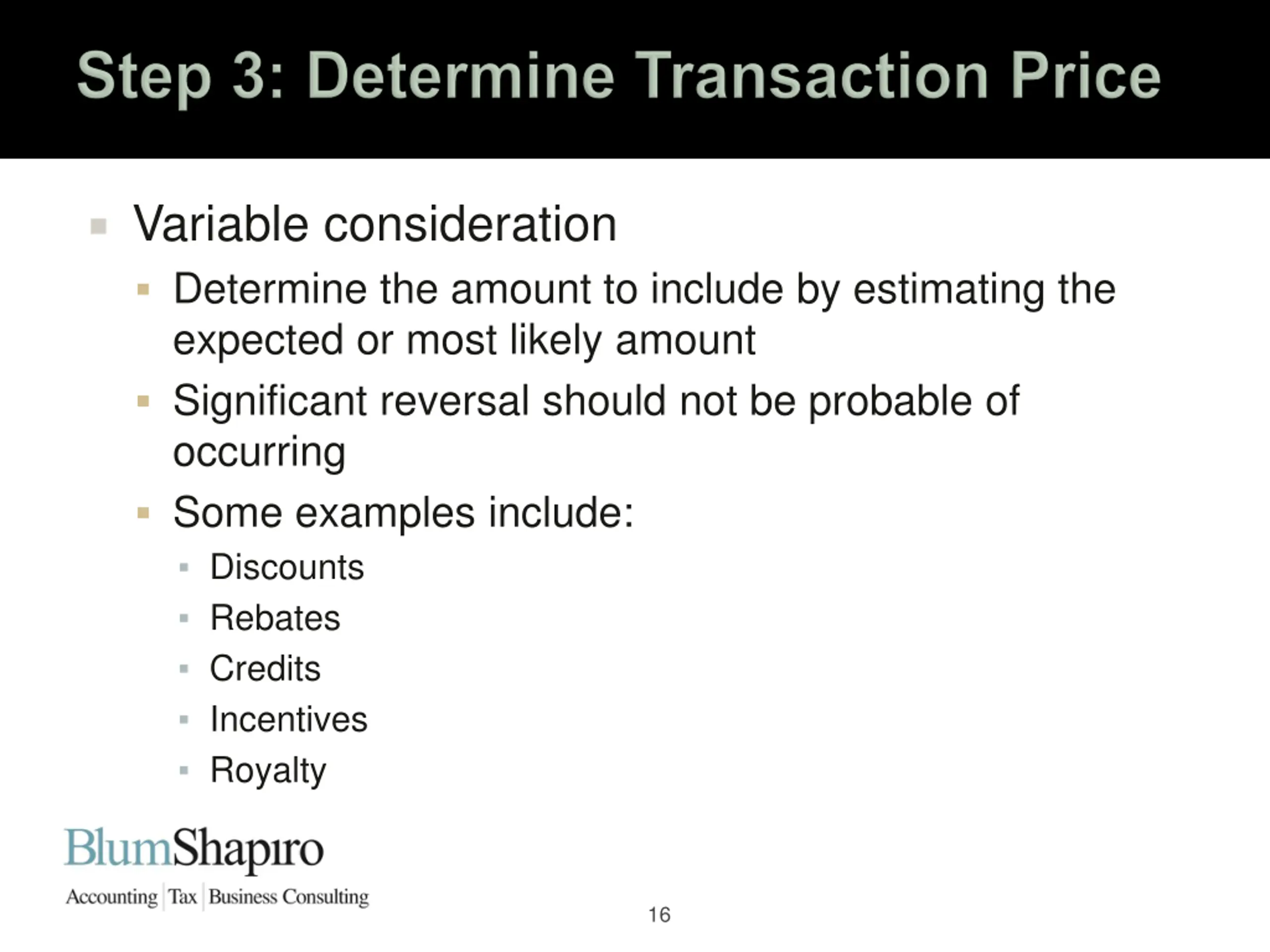 Variable consideration Determine the amount to include by estimating the expected or most likely amount Significant reversal should not be probable of occurring Some examples include: Discounts Rebates Credits Incentives Royalty 16