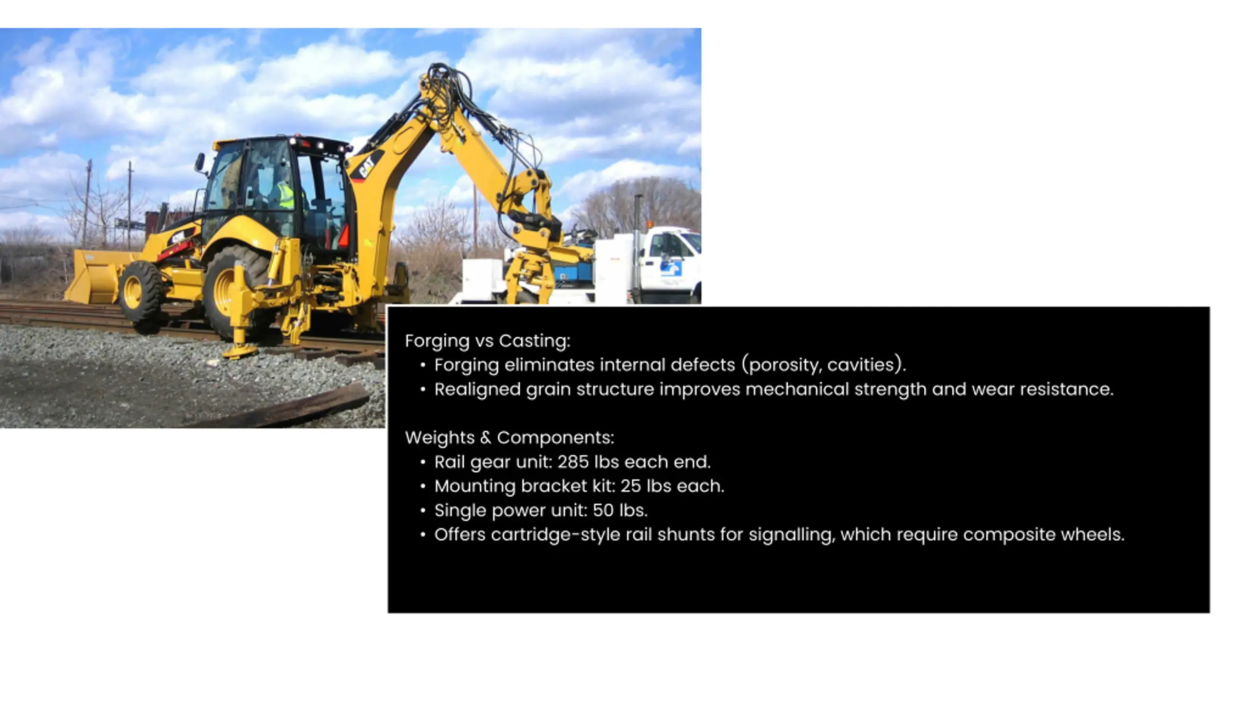 Forging vs Casting: Forging eliminates internal defects (porosity, cavities). Realigned grain structure improves mechanical strength and wear resistance. Lorem ipsum dolor sit amet, consectetur adipiscing elit, sed do eiusmod tempor incididunt ut labore et dolore magna aliqua. Ut enim ad minim veniam, quis nostrud exercitation ullamco laboris nisi ut aliquip ex ea commodo consequat. Duis aute irure dolor in reprehenderit in voluptate Rail gear unit: 285 lbs each end. Mounting bracket kit: 25 lbs each. Single power unit: 50 lbs. Offers cartridge-style rail shunts for signalling, which require composite wheels. Weights & Components: velit esse cillum dolore eu fugiat nulla pariatur.