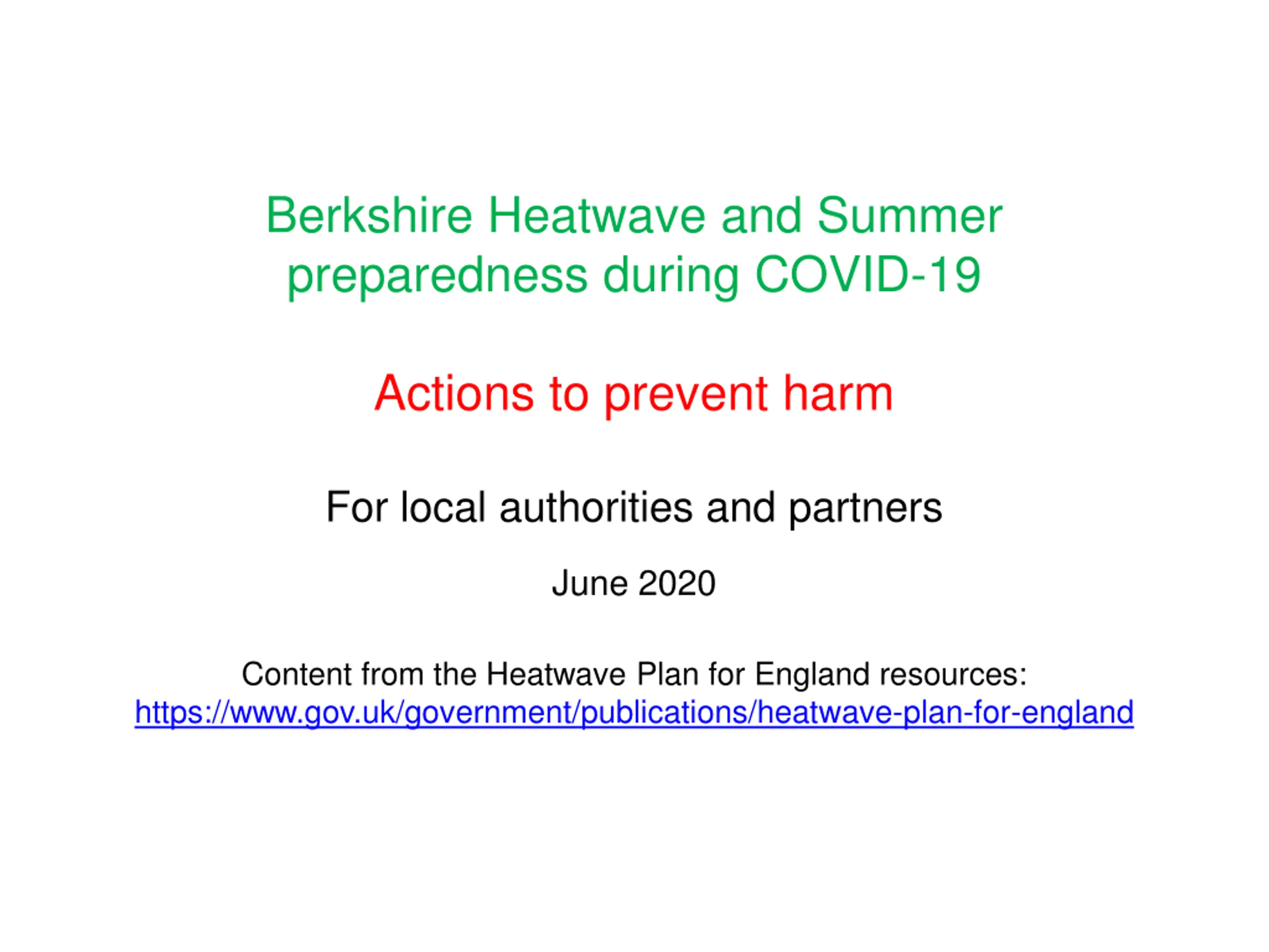 Berkshire Heatwave and Summer preparedness during COVID-19 Actions to prevent harm For local authorities and partners June 2020 Content from the Heatwave Plan for England resources: https://www.gov.uk/government/publications/heatwave-plan-for-england