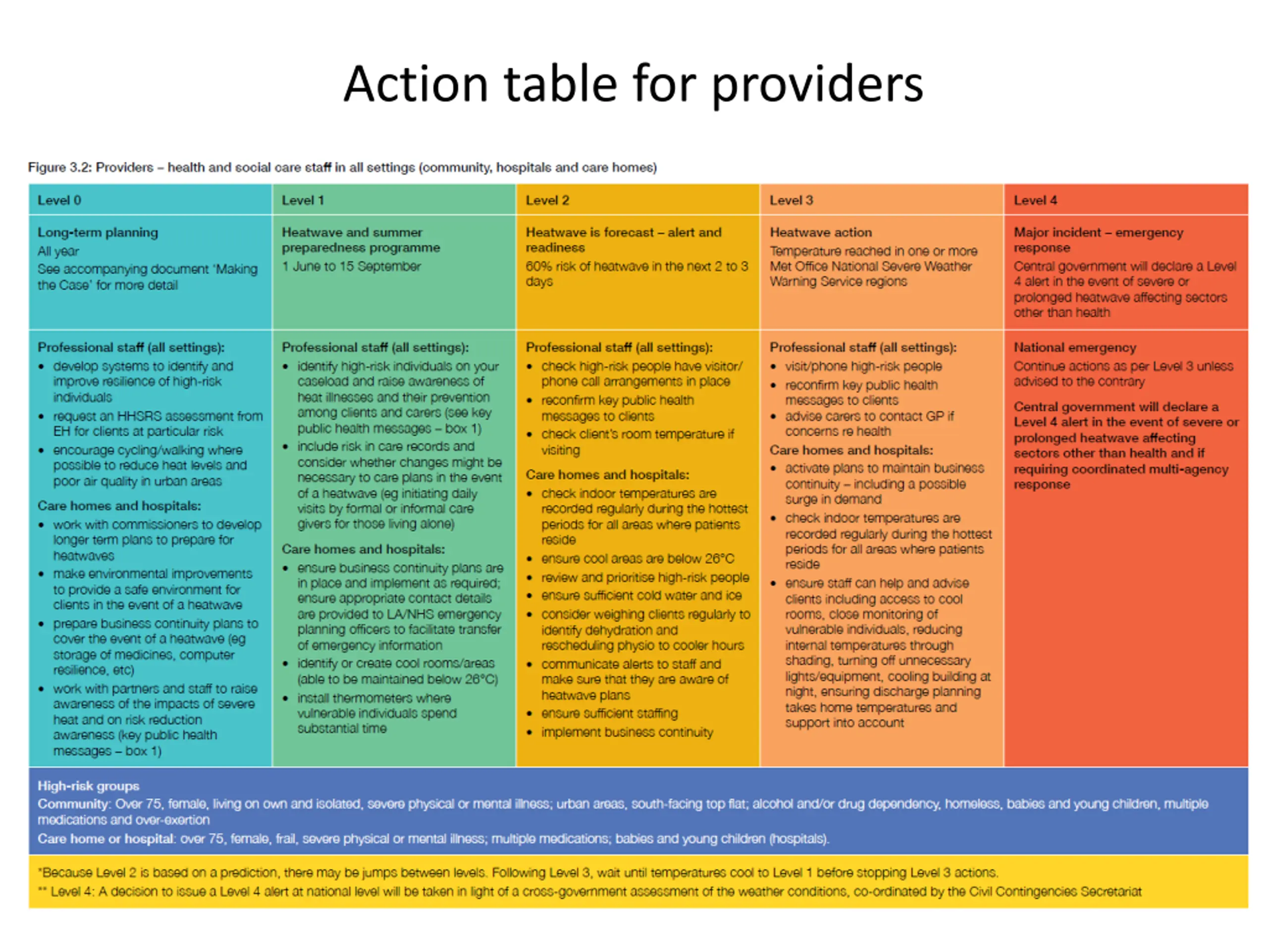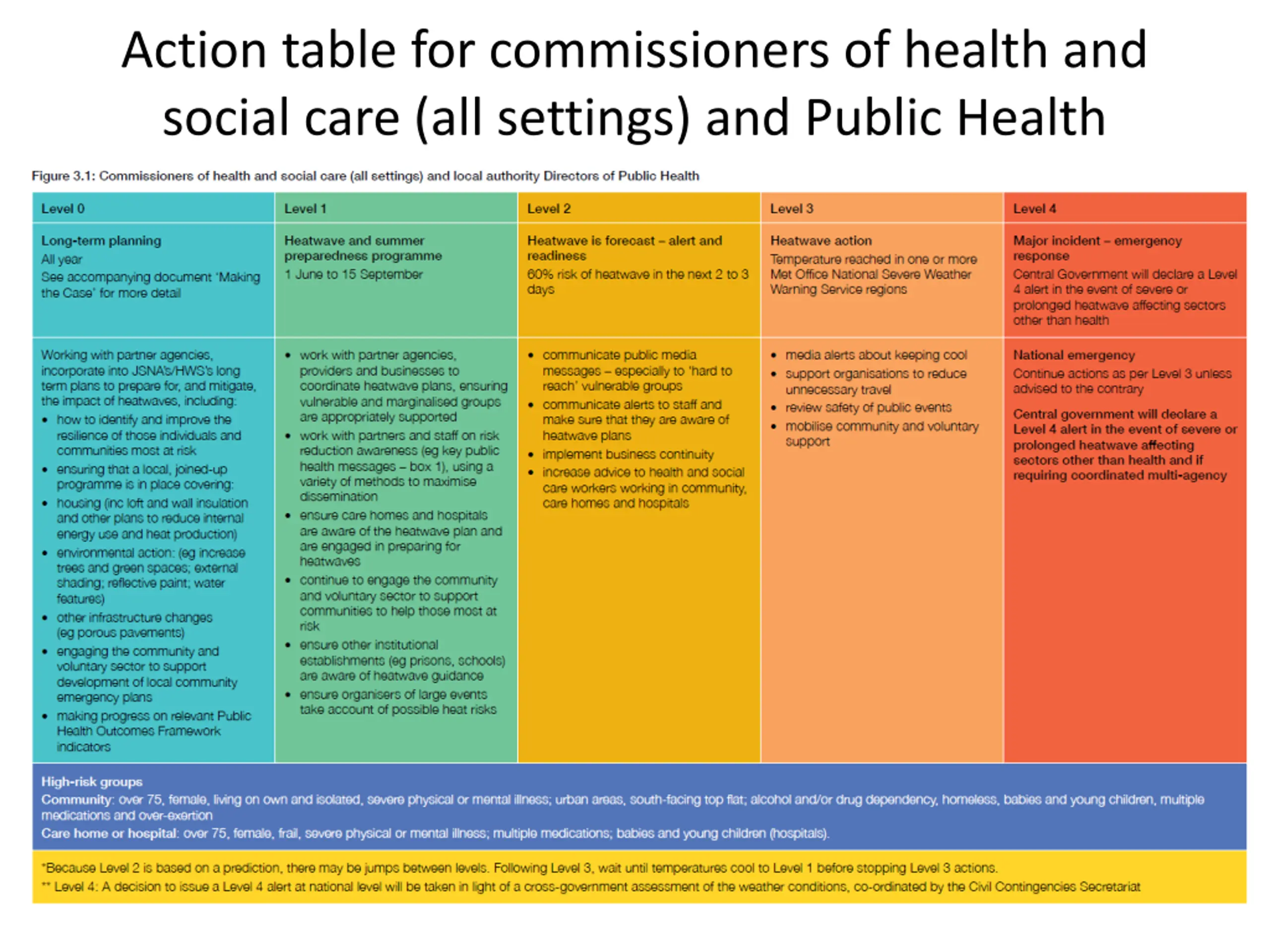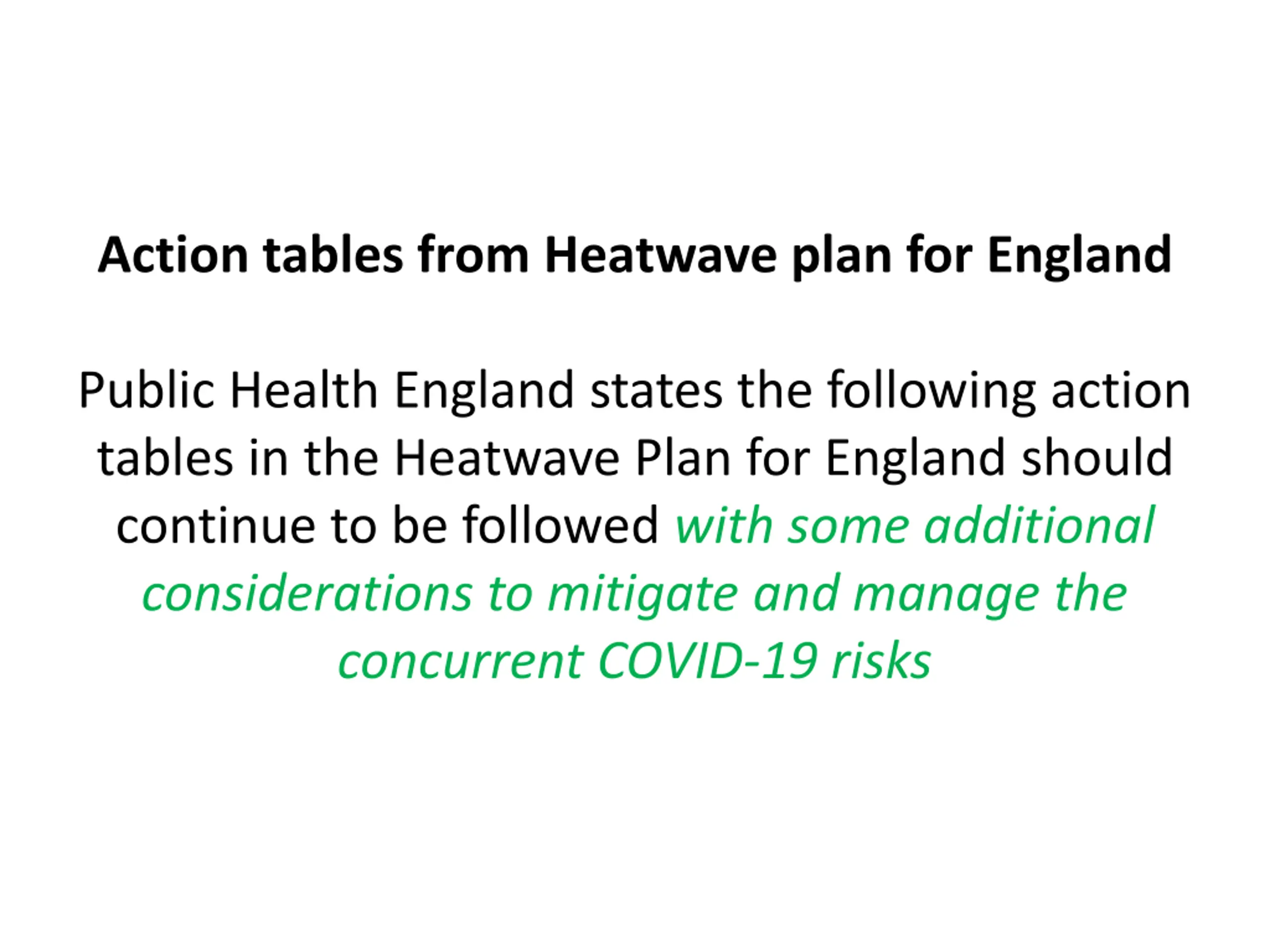 Action tables from Heatwave plan for England Public Health England states the following action tables in the Heatwave Plan for England should continue to be followed with some additional considerations to mitigate and manage the concurrent COVID-19 risks