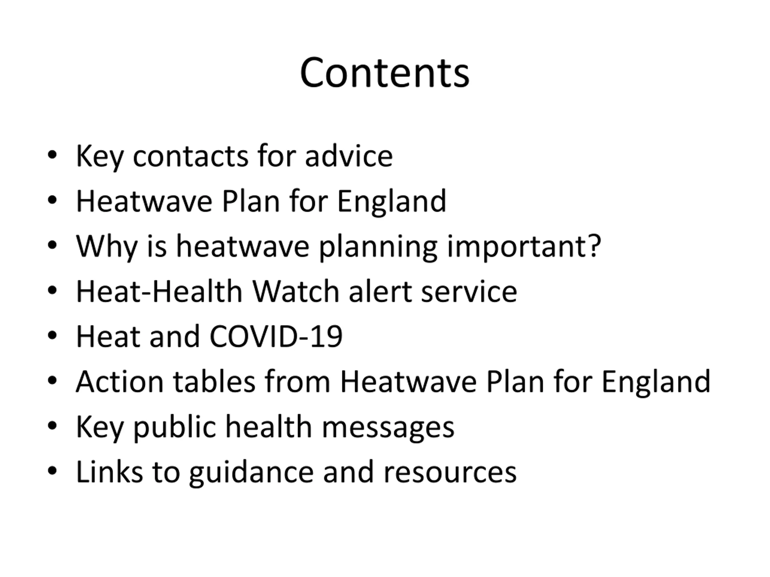 Contents Key contacts for advice Heatwave Plan for England Why is heatwave planning important? Heat-Health Watch alert service Heat and COVID-19 Action tables from Heatwave Plan for England Key public health messages Links to guidance and resources