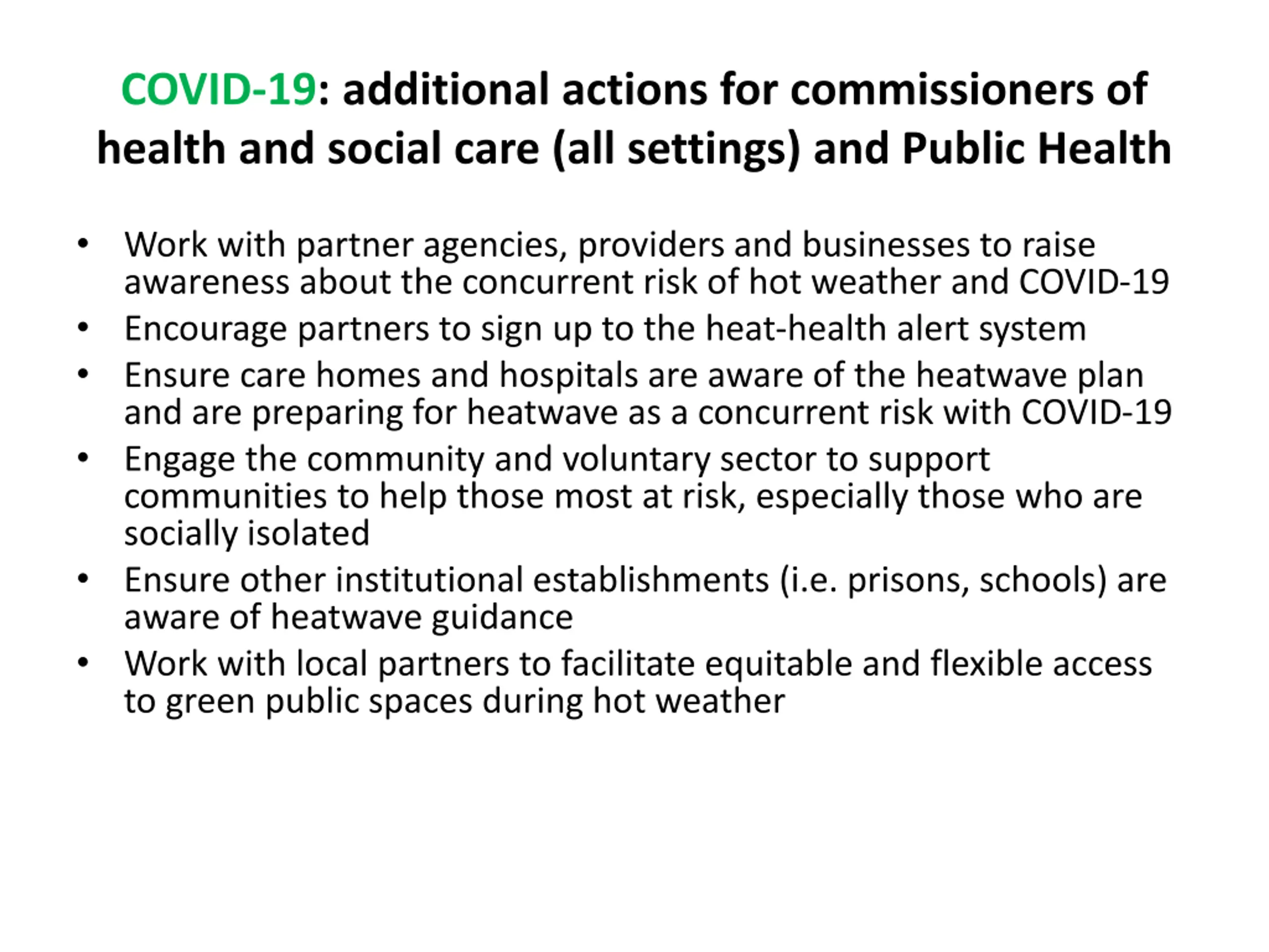 COVID-19: additional actions for commissioners of health and social care (all settings) and Public Health Work with partner agencies, providers and businesses to raise awareness about the concurrent risk of hot weather and COVID-19 Encourage partners to sign up to the heat-health alert system Ensure care homes and hospitals are aware of the heatwave plan and are preparing for heatwave as a concurrent risk with COVID-19 Engage the community and voluntary sector to support communities to help those most at risk, especially those who are socially isolated Ensure other institutional establishments (i.e. prisons, schools) are aware of heatwave guidance Work with local partners to facilitate equitable and flexible access to green public spaces during hot weather