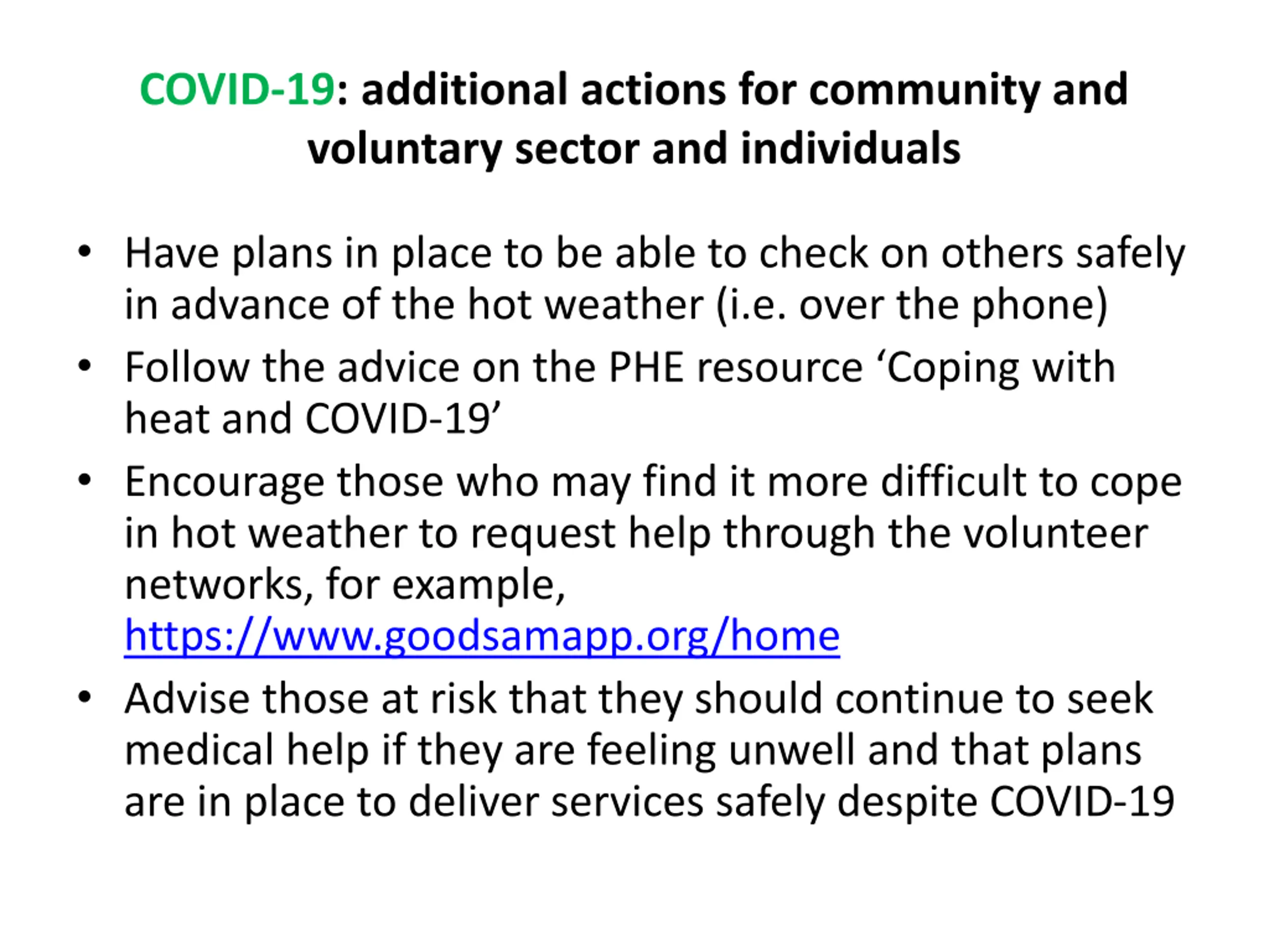 COVID-19: additional actions for community and voluntary sector and individuals Have plans in place to be able to check on others safely in advance of the hot weather (i.e. over the phone) Follow the advice on the PHE resource Coping with heat and COVID-19 Encourage those who may find it more difficult to cope in hot weather to request help through the volunteer networks, for example, https://www.goodsamapp.org/home Advise those at risk that they should continue to seek medical help if they are feeling unwell and that plans are in place to deliver services safely despite COVID-19