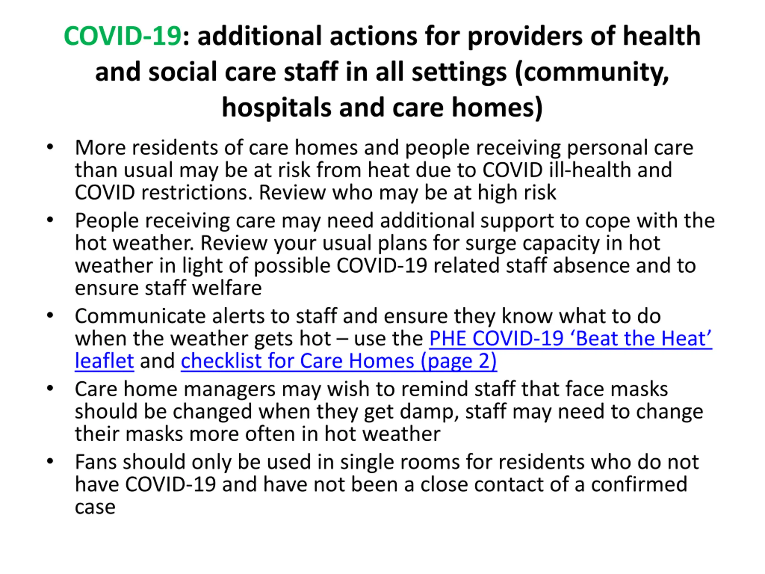 COVID-19: additional actions for providers of health and social care staff in all settings (community, hospitals and care homes) More residents of care homes and people receiving personal care than usual may be at risk from heat due to COVID ill-health and COVID restrictions. Review who may be at high risk People receiving care may need additional support to cope with the hot weather. Review your usual plans for surge capacity in hot weather in light of possible COVID-19 related staff absence and to ensure staff welfare Communicate alerts to staff and ensure they know what to do when the weather gets hot use the PHE COVID-19 Beat the Heat leaflet and checklist for Care Homes (page 2) Care home managers may wish to remind staff that face masks should be changed when they get damp, staff may need to change their masks more often in hot weather Fans should only be used in single rooms for residents who do not have COVID-19 and have not been a close contact of a confirmed case