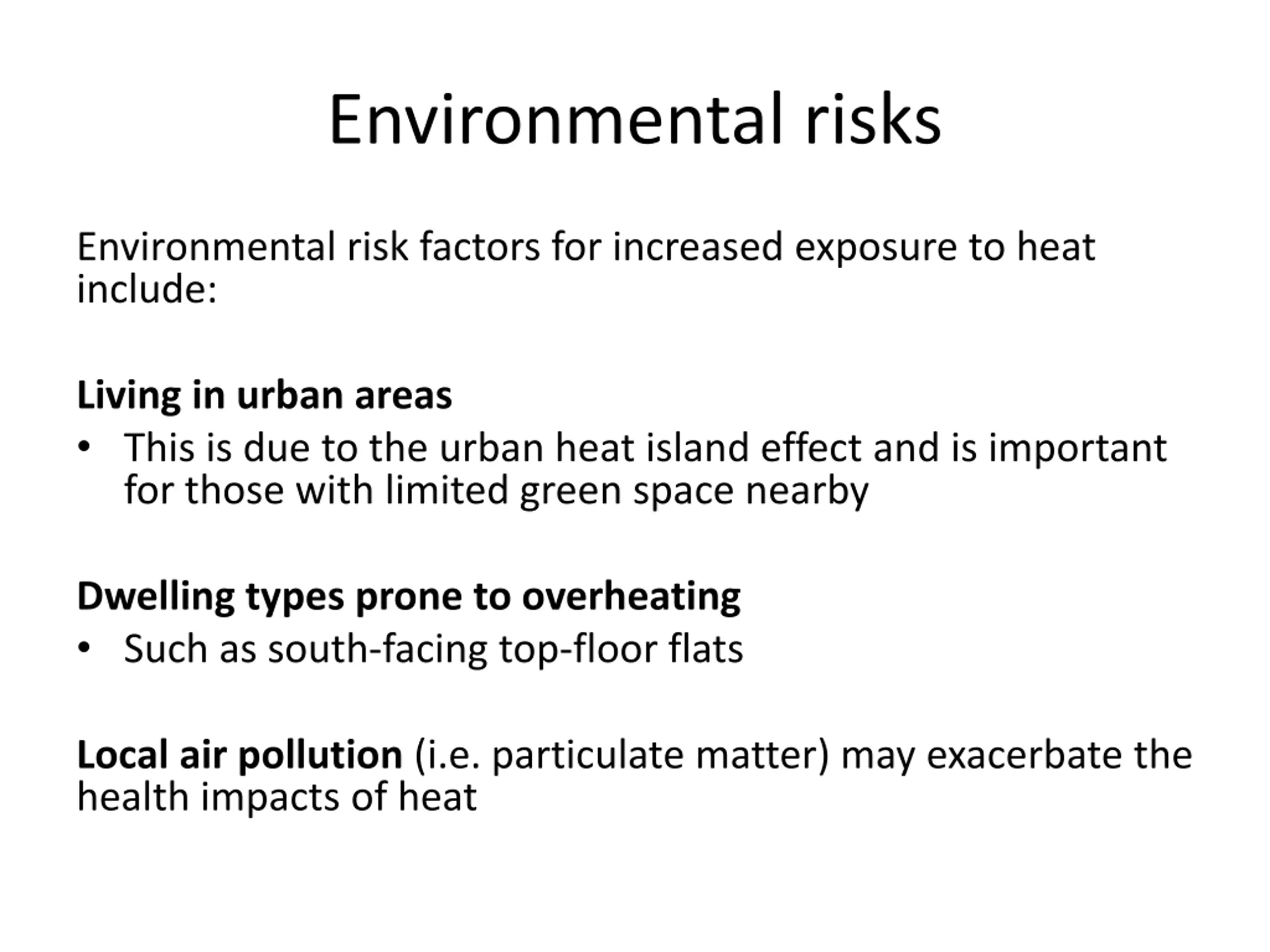 Environmental risks Environmental risk factors for increased exposure to heat include: Living in urban areas This is due to the urban heat island effect and is important for those with limited green space nearby Dwelling types prone to overheating Such as south-facing top-floor flats Local air pollution (i.e. particulate matter) may exacerbate the health impacts of heat