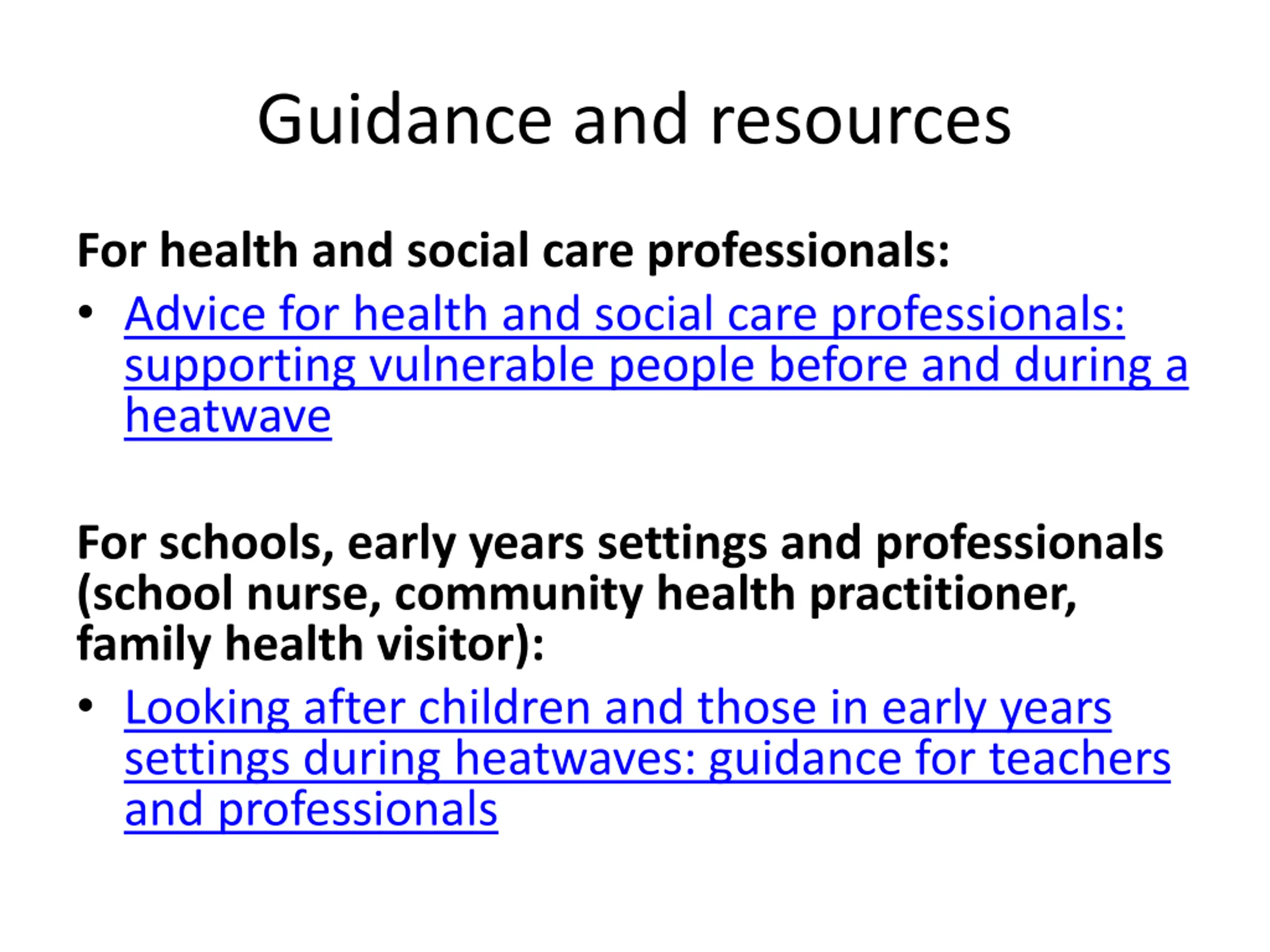 Guidance and resources For health and social care professionals: Advice for health and social care professionals: supporting vulnerable people before and during a heatwave For schools, early years settings and professionals (school nurse, community health practitioner, family health visitor): Looking after children and those in early years settings during heatwaves: guidance for teachers and professionals