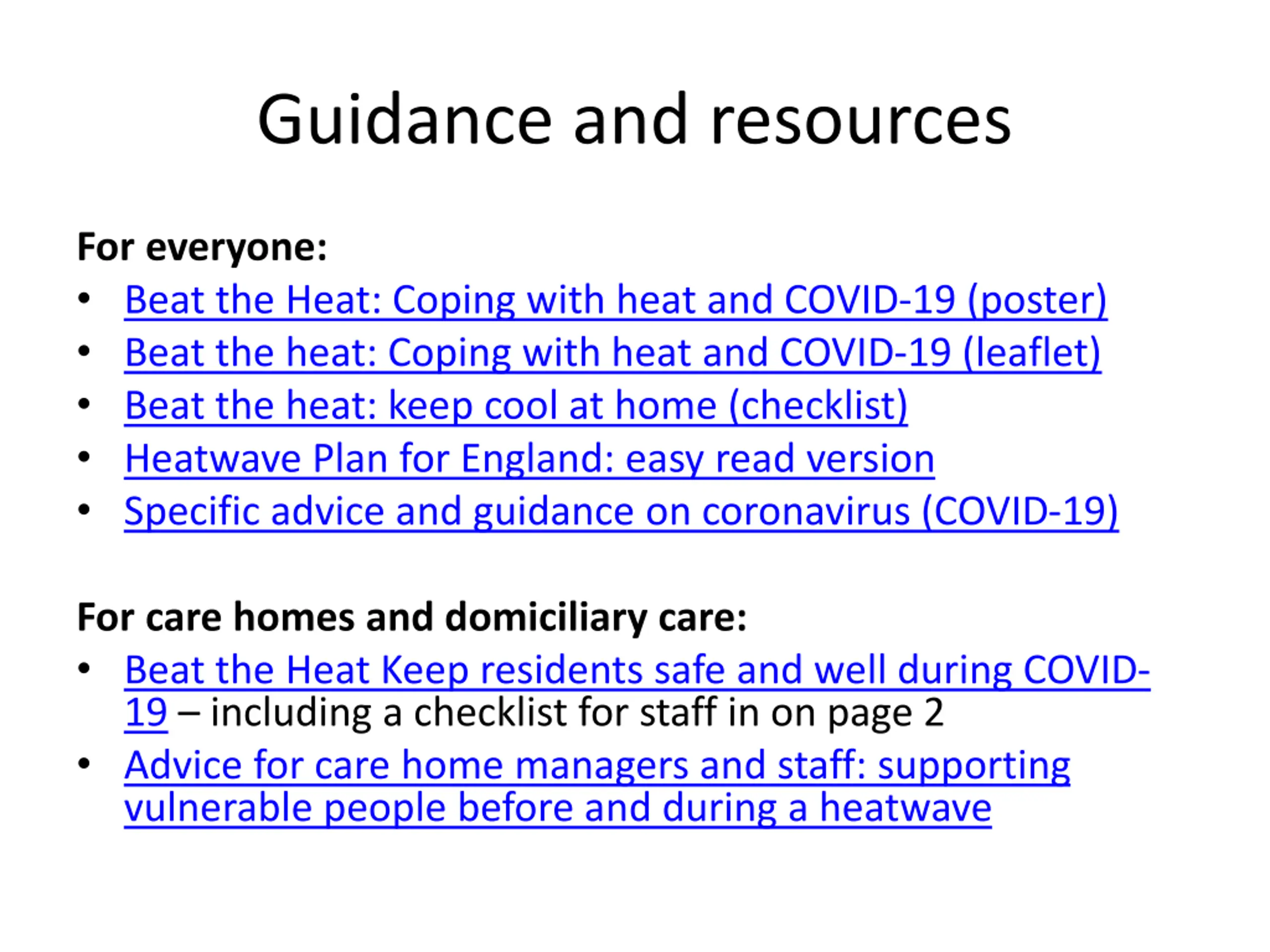 Guidance and resources For everyone: Beat the Heat: Coping with heat and COVID-19 (poster) Beat the heat: Coping with heat and COVID-19 (leaflet) Beat the heat: keep cool at home (checklist) Heatwave Plan for England: easy read version Specific advice and guidance on coronavirus (COVID-19) For care homes and domiciliary care: Beat the Heat Keep residents safe and well during COVID- 19 including a checklist for staff in on page 2 Advice for care home managers and staff: supporting vulnerable people before and during a heatwave