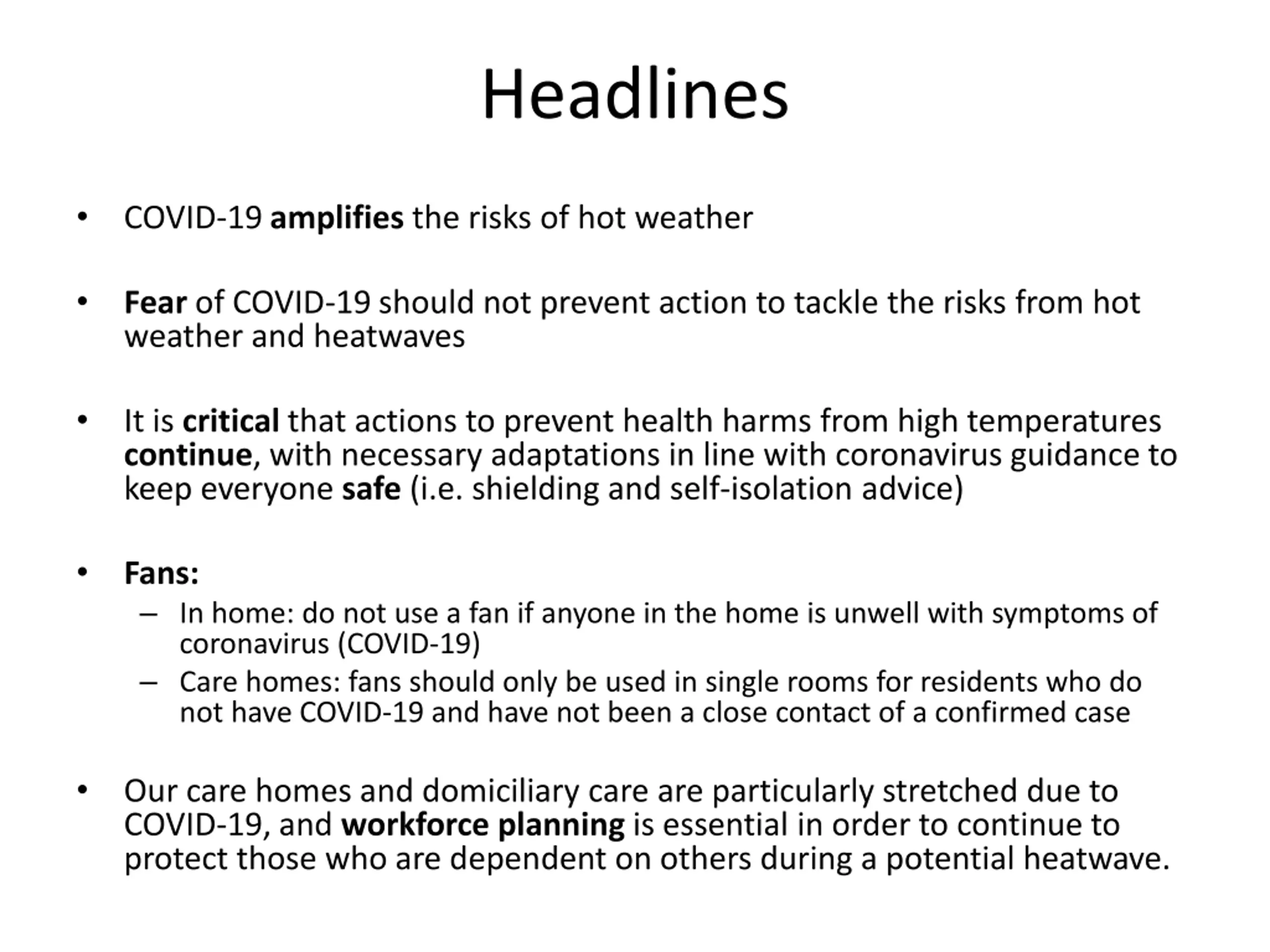 Headlines COVID-19 amplifies the risks of hot weather Fear of COVID-19 should not prevent action to tackle the risks from hot weather and heatwaves It is critical that actions to prevent health harms from high temperatures continue, with necessary adaptations in line with coronavirus guidance to keep everyone safe (i.e. shielding and self-isolation advice) Fans: In home: do not use a fan if anyone in the home is unwell with symptoms of coronavirus (COVID-19) Care homes: fans should only be used in single rooms for residents who do not have COVID-19 and have not been a close contact of a confirmed case Our care homes and domiciliary care are particularly stretched due to COVID-19, and workforce planning is essential in order to continue to protect those who are dependent on others during a potential heatwave.