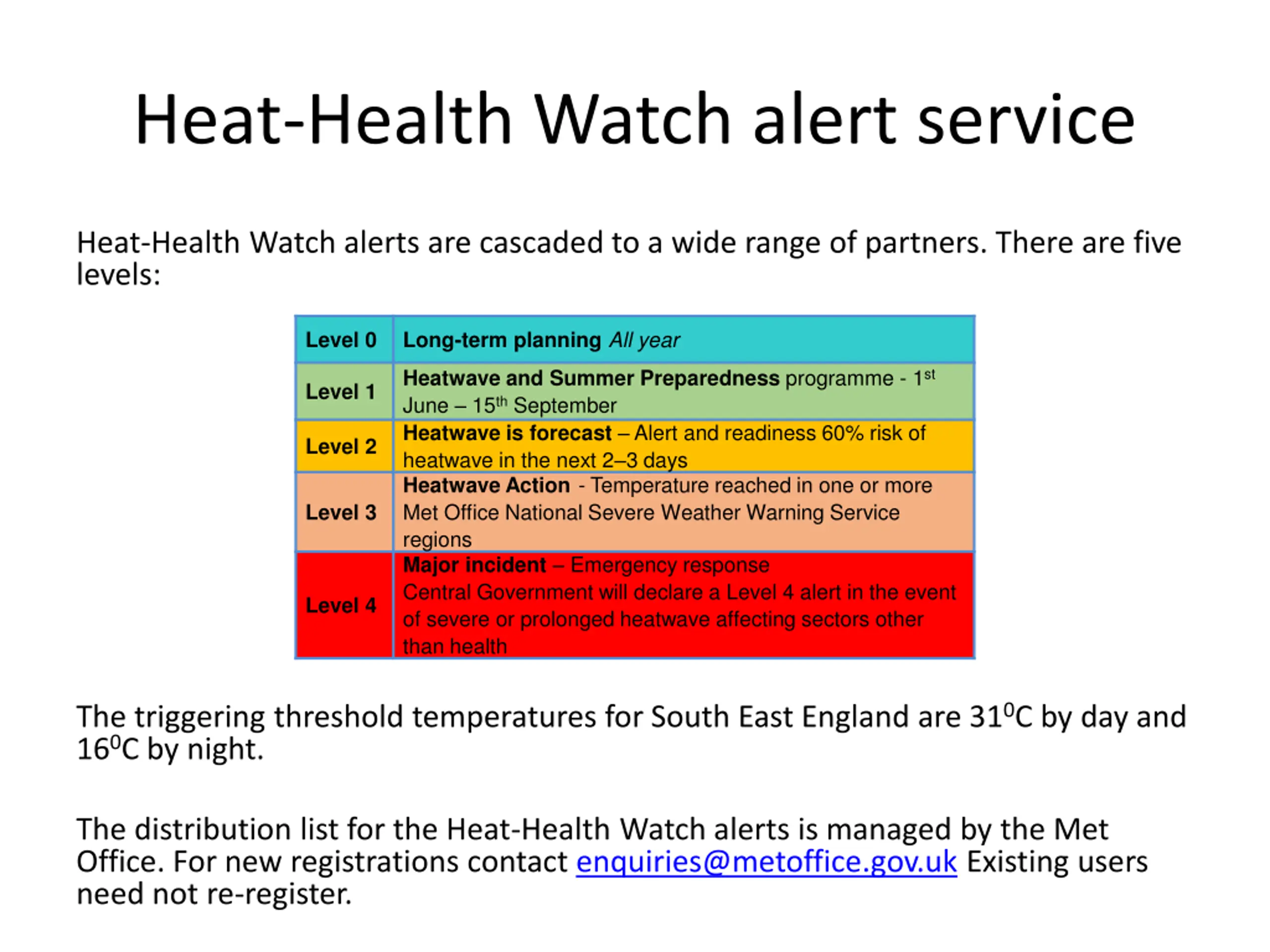 Heat-Health Watch alert service Heat-Health Watch alerts are cascaded to a wide range of partners. There are five levels: Long-term planning All year Level 0 Heatwave and Summer Preparedness programme - 1st June 15thSeptember Heatwave is forecast Alert and readiness 60% risk of heatwave in the next 2 3 days Heatwave Action - Temperature reached in one or more Met Office National Severe Weather Warning Service regions Major incident Emergency response Central Government will declare a Level 4 alert in the event of severe or prolonged heatwave affecting sectors other than health Level 1 Level 2 Level 3 Level 4 The triggering threshold temperatures for South East England are 310C by day and 160C by night. The distribution list for the Heat-Health Watch alerts is managed by the Met Office. For new registrations contact enquiries@metoffice.gov.uk Existing users need not re-register.
