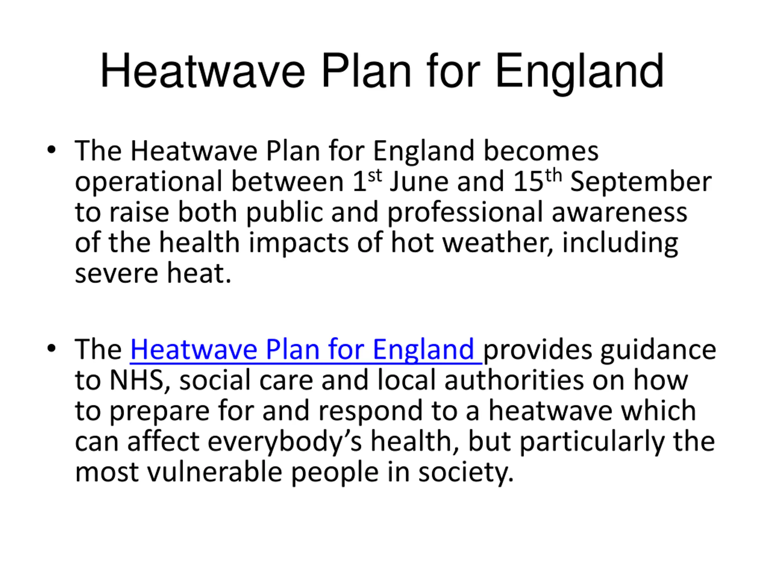Heatwave Plan for England The Heatwave Plan for England becomes operational between 1stJune and 15thSeptember to raise both public and professional awareness of the health impacts of hot weather, including severe heat. The Heatwave Plan for England provides guidance to NHS, social care and local authorities on how to prepare for and respond to a heatwave which can affect everybody s health, but particularly the most vulnerable people in society.