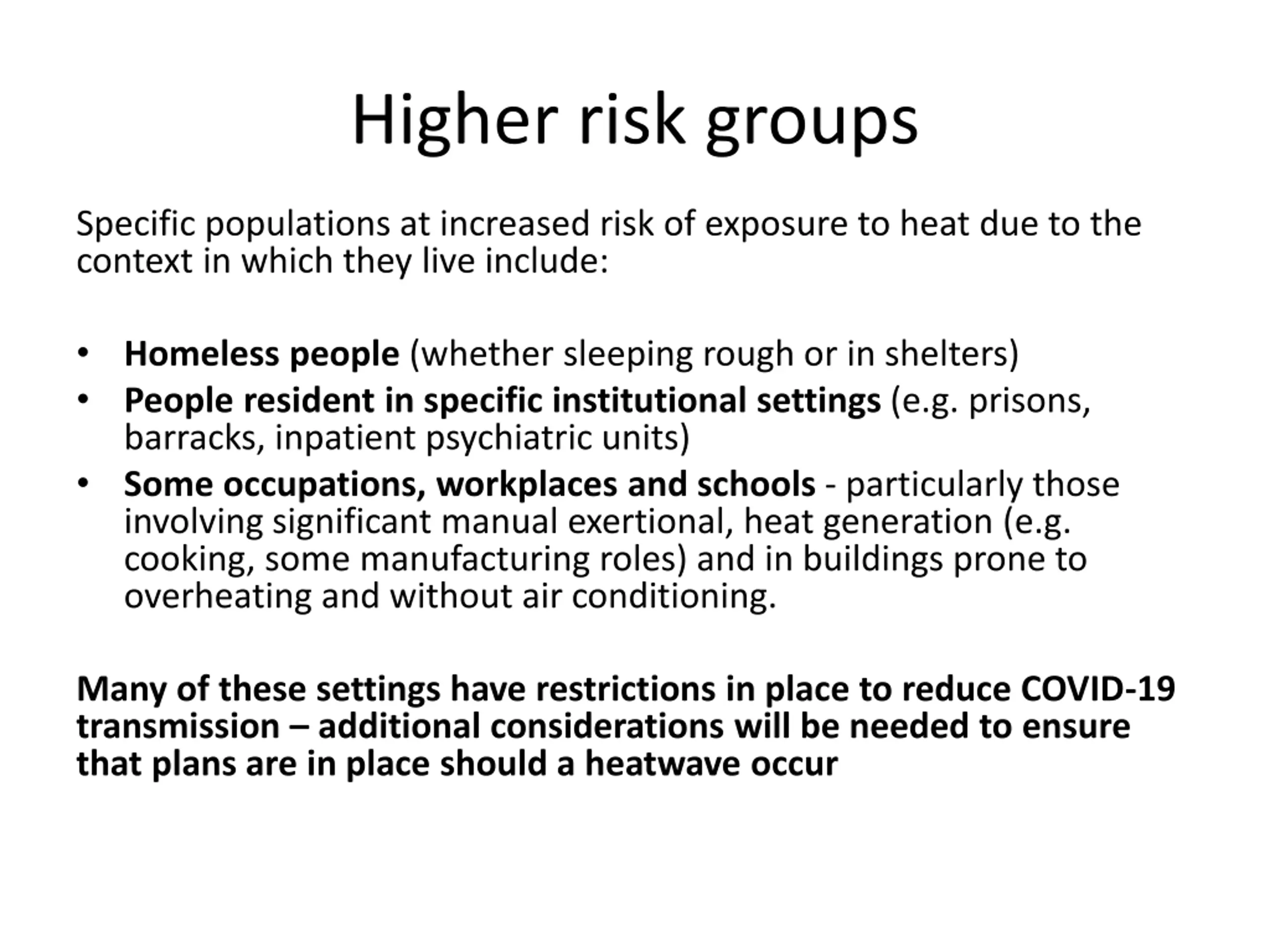 Higher risk groups Specific populations at increased risk of exposure to heat due to the context in which they live include: Homeless people (whether sleeping rough or in shelters) People resident in specific institutional settings (e.g. prisons, barracks, inpatient psychiatric units) Some occupations, workplaces and schools - particularly those involving significant manual exertional, heat generation (e.g. cooking, some manufacturing roles) and in buildings prone to overheating and without air conditioning. Many of these settings have restrictions in place to reduce COVID-19 transmission additional considerations will be needed to ensure that plans are in place should a heatwave occur