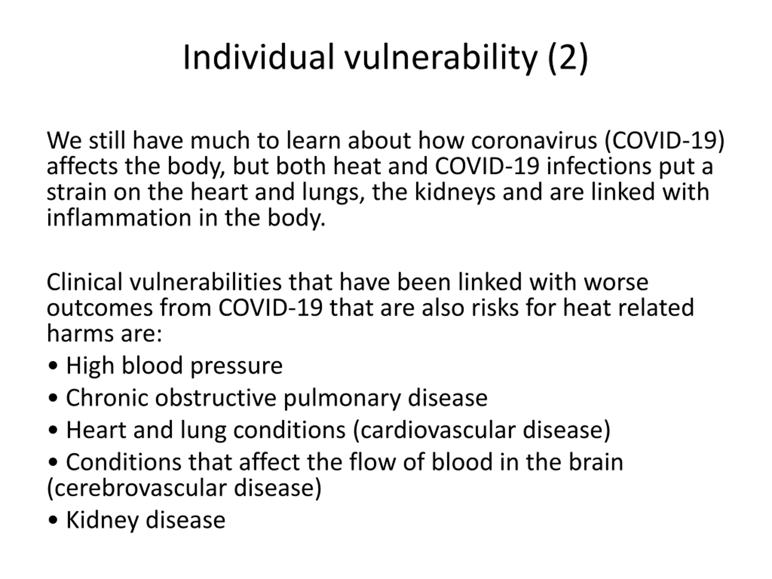 Individual vulnerability (2) We still have much to learn about how coronavirus (COVID-19) affects the body, but both heat and COVID-19 infections put a strain on the heart and lungs, the kidneys and are linked with inflammation in the body. Clinical vulnerabilities that have been linked with worse outcomes from COVID-19 that are also risks for heat related harms are: High blood pressure Chronic obstructive pulmonary disease Heart and lung conditions (cardiovascular disease) Conditions that affect the flow of blood in the brain (cerebrovascular disease) Kidney disease