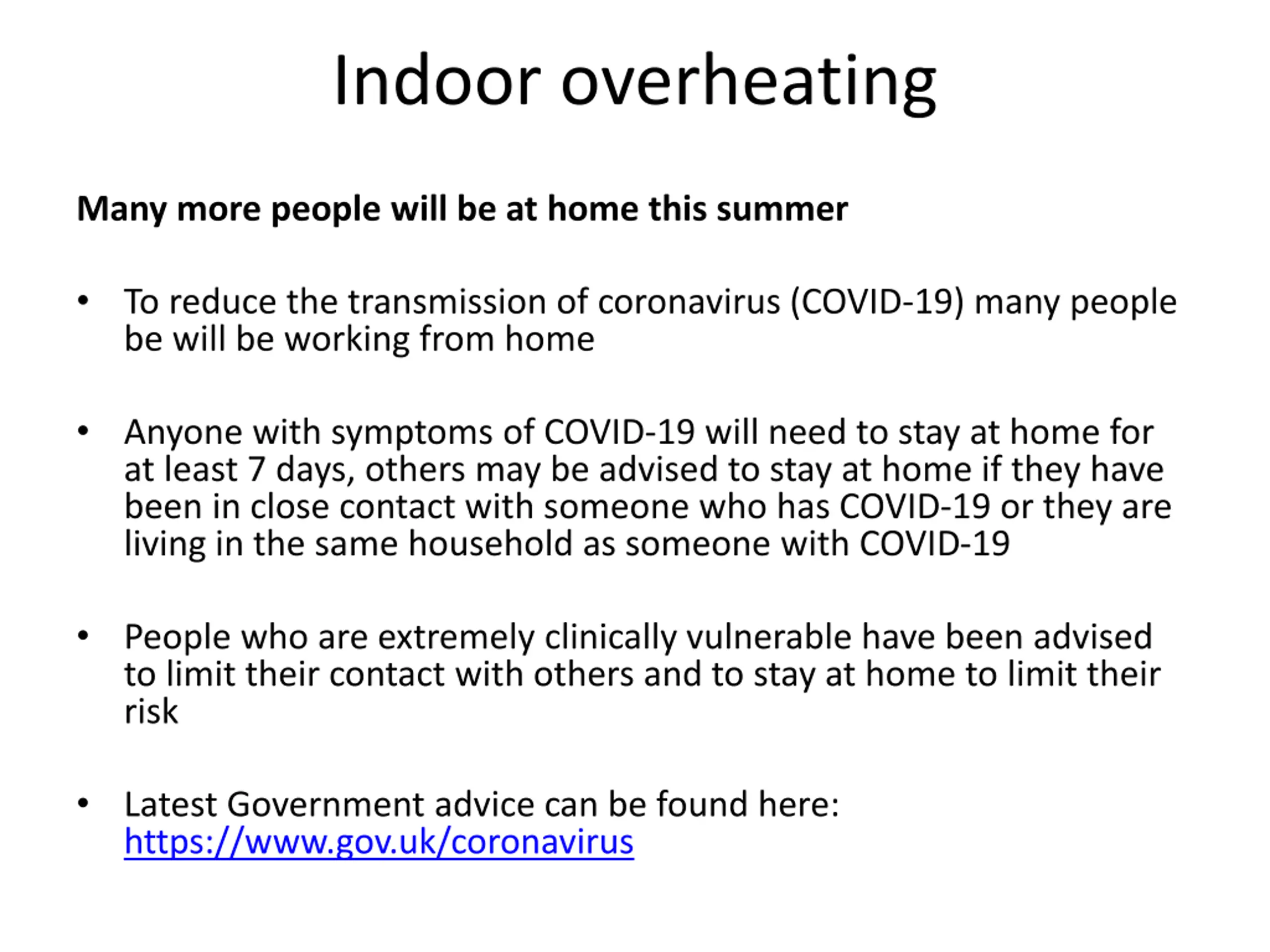 Indoor overheating Many more people will be at home this summer To reduce the transmission of coronavirus (COVID-19) many people be will be working from home Anyone with symptoms of COVID-19 will need to stay at home for at least 7 days, others may be advised to stay at home if they have been in close contact with someone who has COVID-19 or they are living in the same household as someone with COVID-19 People who are extremely clinically vulnerable have been advised to limit their contact with others and to stay at home to limit their risk Latest Government advice can be found here: https://www.gov.uk/coronavirus