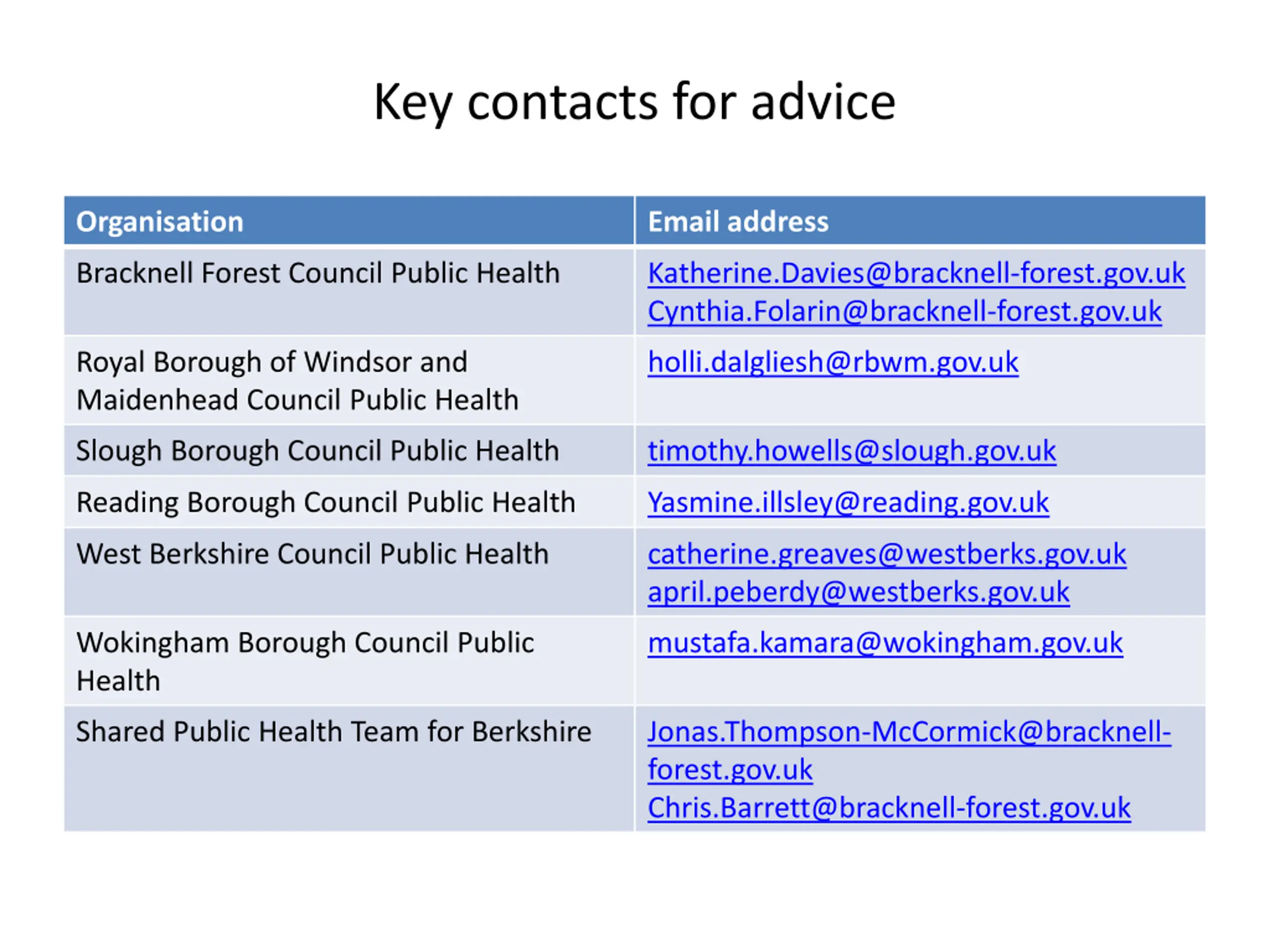 Key contacts for advice Organisation Email address Bracknell Forest Council Public Health Katherine.Davies@bracknell-forest.gov.uk Cynthia.Folarin@bracknell-forest.gov.uk Royal Borough of Windsor and Maidenhead Council Public Health holli.dalgliesh@rbwm.gov.uk Slough Borough Council Public Health timothy.howells@slough.gov.uk Reading Borough Council Public Health Yasmine.illsley@reading.gov.uk West Berkshire Council Public Health catherine.greaves@westberks.gov.uk april.peberdy@westberks.gov.uk Wokingham Borough Council Public Health mustafa.kamara@wokingham.gov.uk Shared Public Health Team for Berkshire Jonas.Thompson-McCormick@bracknell- forest.gov.uk Chris.Barrett@bracknell-forest.gov.uk