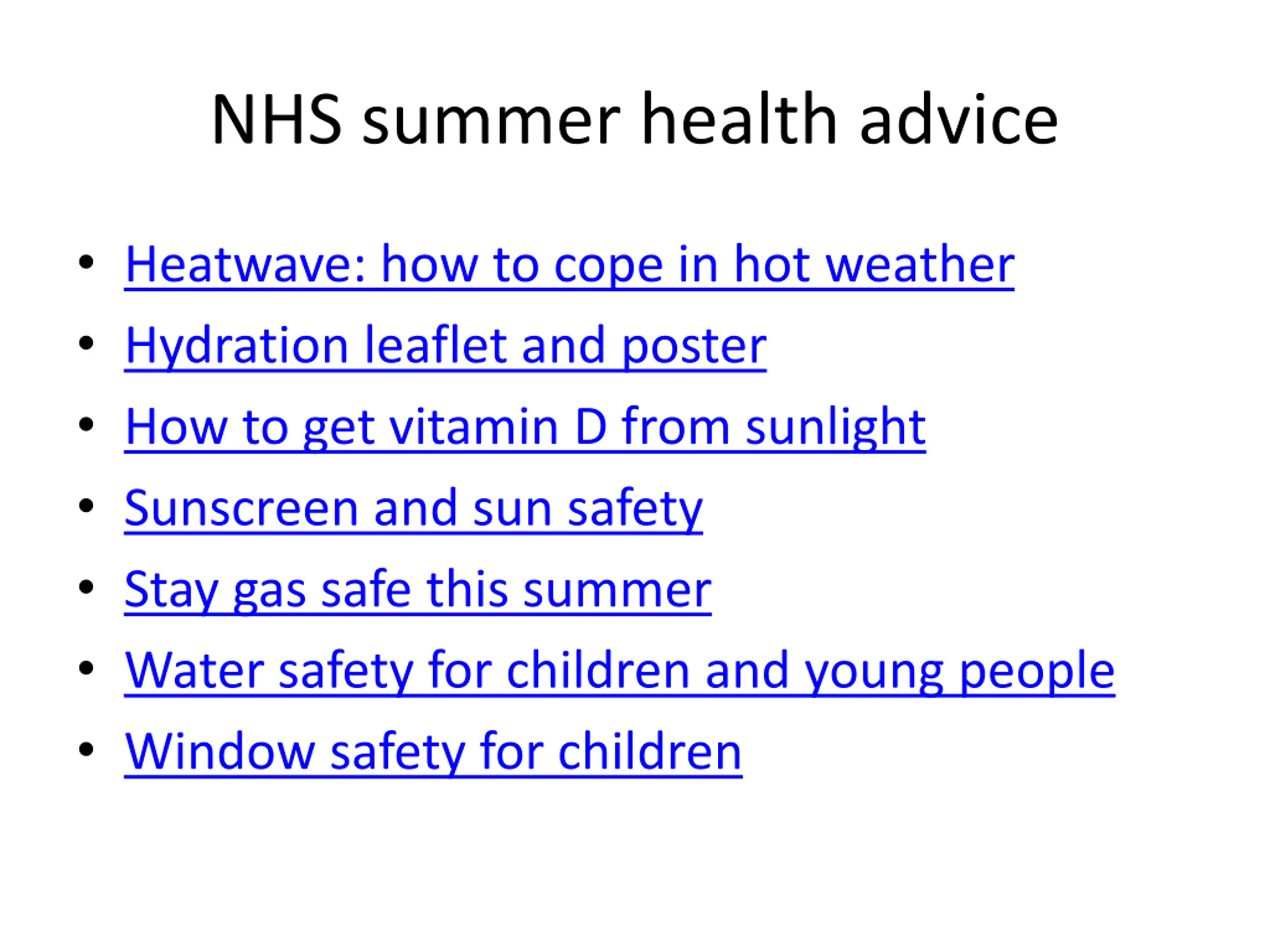 NHS summer health advice Heatwave: how to cope in hot weather Hydration leaflet and poster How to get vitamin D from sunlight Sunscreen and sun safety Stay gas safe this summer Water safety for children and young people Window safety for children