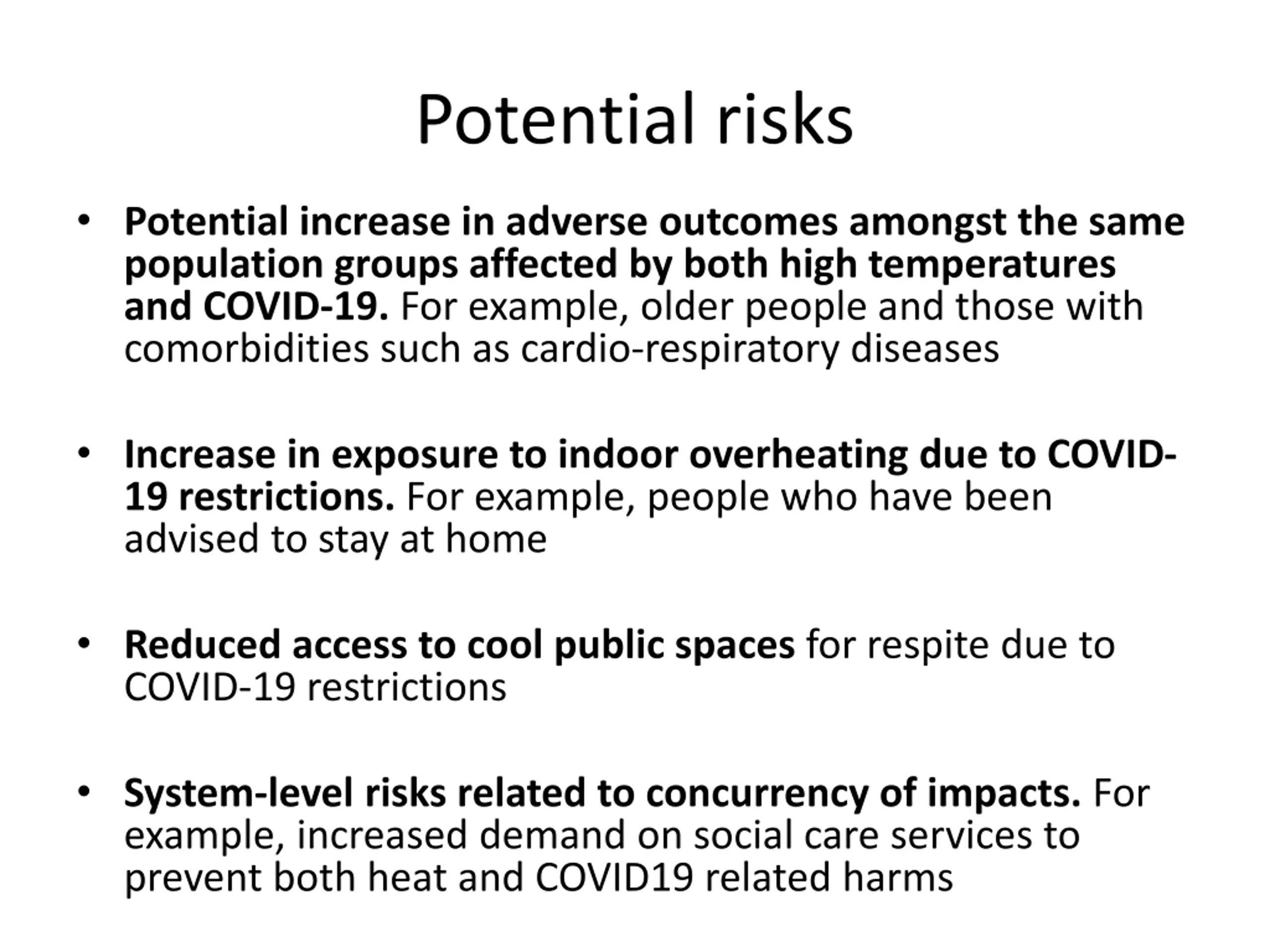 Potential risks Potential increase in adverse outcomes amongst the same population groups affected by both high temperatures and COVID-19. For example, older people and those with comorbidities such as cardio-respiratory diseases Increase in exposure to indoor overheating due to COVID- 19 restrictions. For example, people who have been advised to stay at home Reduced access to cool public spaces for respite due to COVID-19 restrictions System-level risks related to concurrency of impacts. For example, increased demand on social care services to prevent both heat and COVID19 related harms