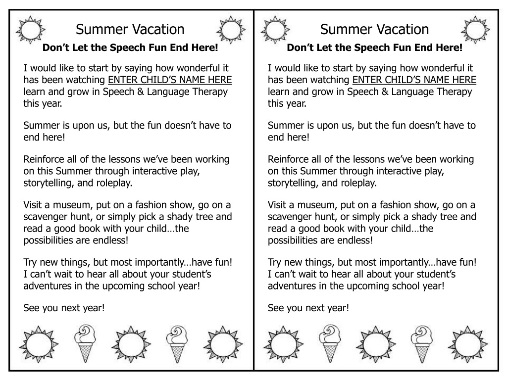 Summer Vacation Don t Let the Speech Fun End Here! Summer Vacation Don t Let the Speech Fun End Here! I would like to start by saying how wonderful it has been watching ENTER CHILD S NAME HERE learn and grow in Speech & Language Therapy this year. I would like to start by saying how wonderful it has been watching ENTER CHILD S NAME HERE learn and grow in Speech & Language Therapy this year. While addressing difficulties with speech, it is important that your child is practicing not only in Speech Therapy, but at home as well. While addressing difficulties with speech, it is important that your child is practicing not only in Speech Therapy, but at home as well. Here I am providing you with some quick and easy ideas to continue working on your student s goals over the Summer break. Here I am providing you with some quick and easy ideas to continue working on your student s goals over the Summer break. There are other ways to keep your child learning over the break as well. Visit a museum, put on a fashion show, go on a scavenger hunt, or simply pick a shady tree and read a good book with your child the possibilities are endless! There are other ways to keep your child learning over the break as well. Visit a museum, put on a fashion show, go on a scavenger hunt, or simply pick a shady tree and read a good book with your child the possibilities are endless! Try new things, but most importantly have fun! I can t wait to hear all about your student s adventures in the upcoming school year! Try new things, but most importantly have fun! I can t wait to hear all about your student s adventures in the upcoming school year! I can t wait to see you next year! I can t wait to see you next year!