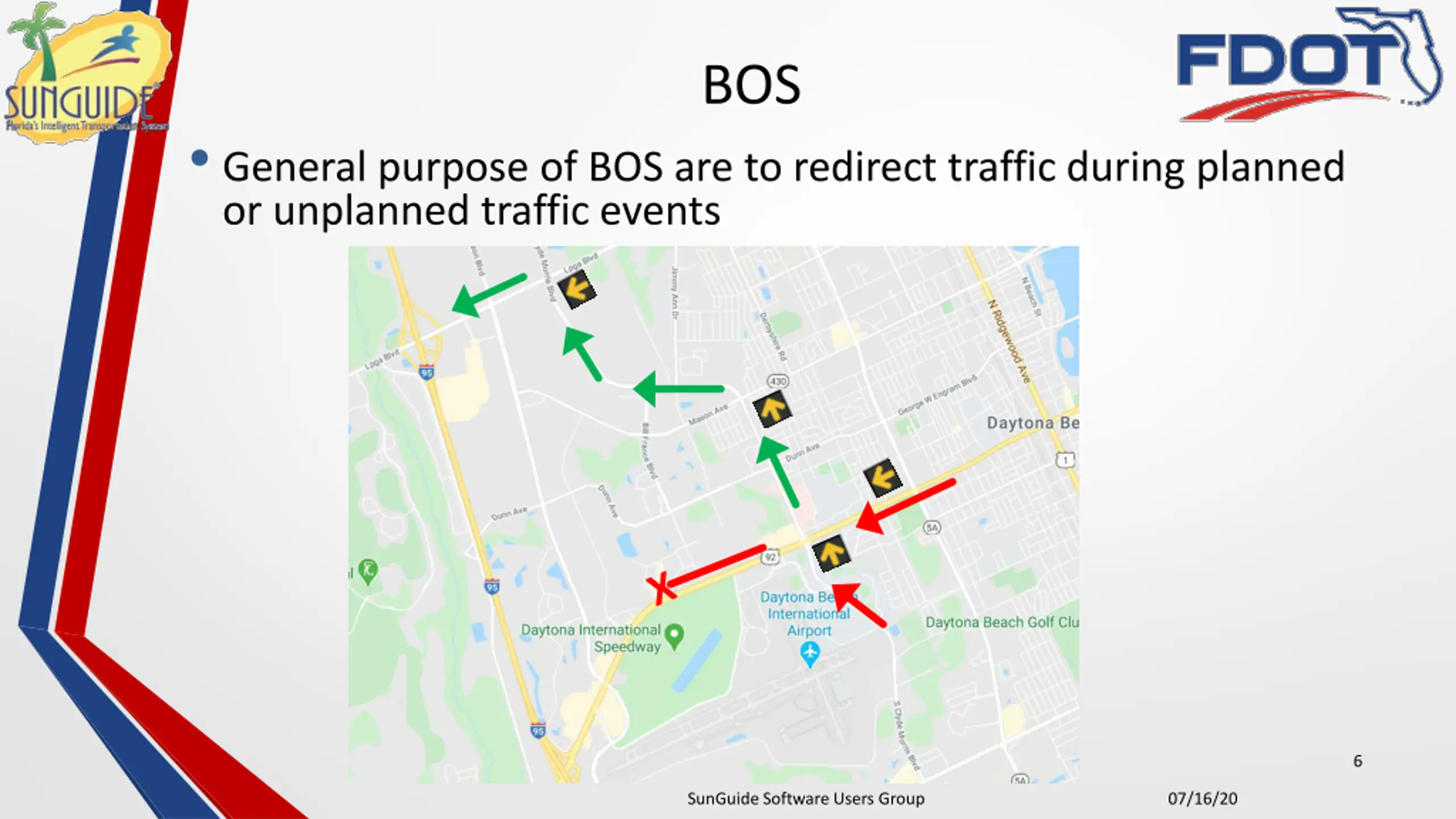 BOS General purpose of BOS are to redirect traffic during planned or unplanned traffic events 6 SunGuide Software Users Group 07/16/20
