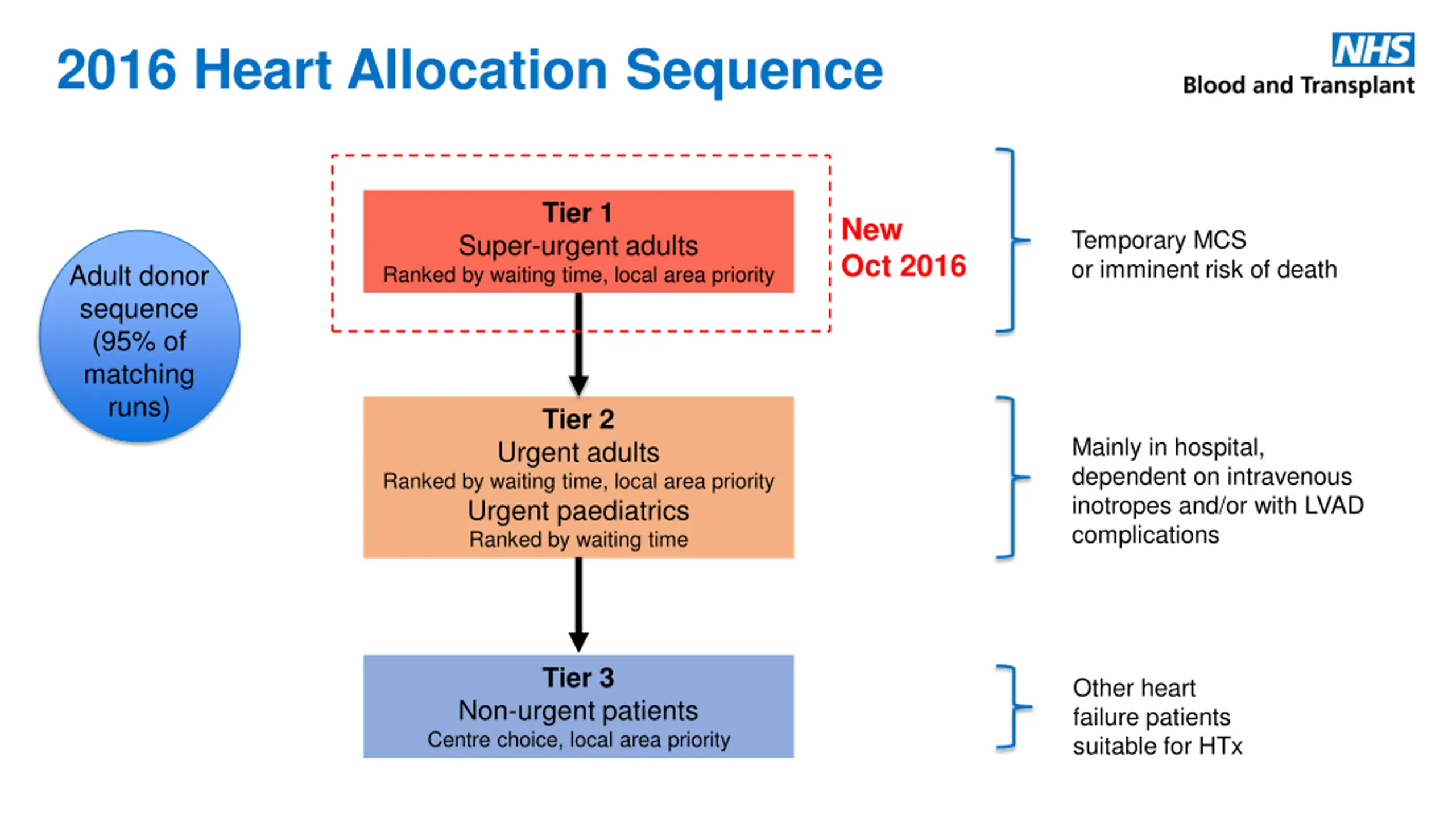 2016 Heart Allocation Sequence Tier 1 New Oct 2016 Temporary MCS or imminent risk of death Super-urgent adults Ranked by waiting time, local area priority Adult donor sequence (95% of matching runs) Tier 2 Mainly in hospital, dependent on intravenous inotropes and/or with LVAD complications Urgent adults Ranked by waiting time, local area priority Urgent paediatrics Ranked by waiting time Tier 3 Other heart failure patients suitable for HTx Non-urgent patients Centre choice, local area priority