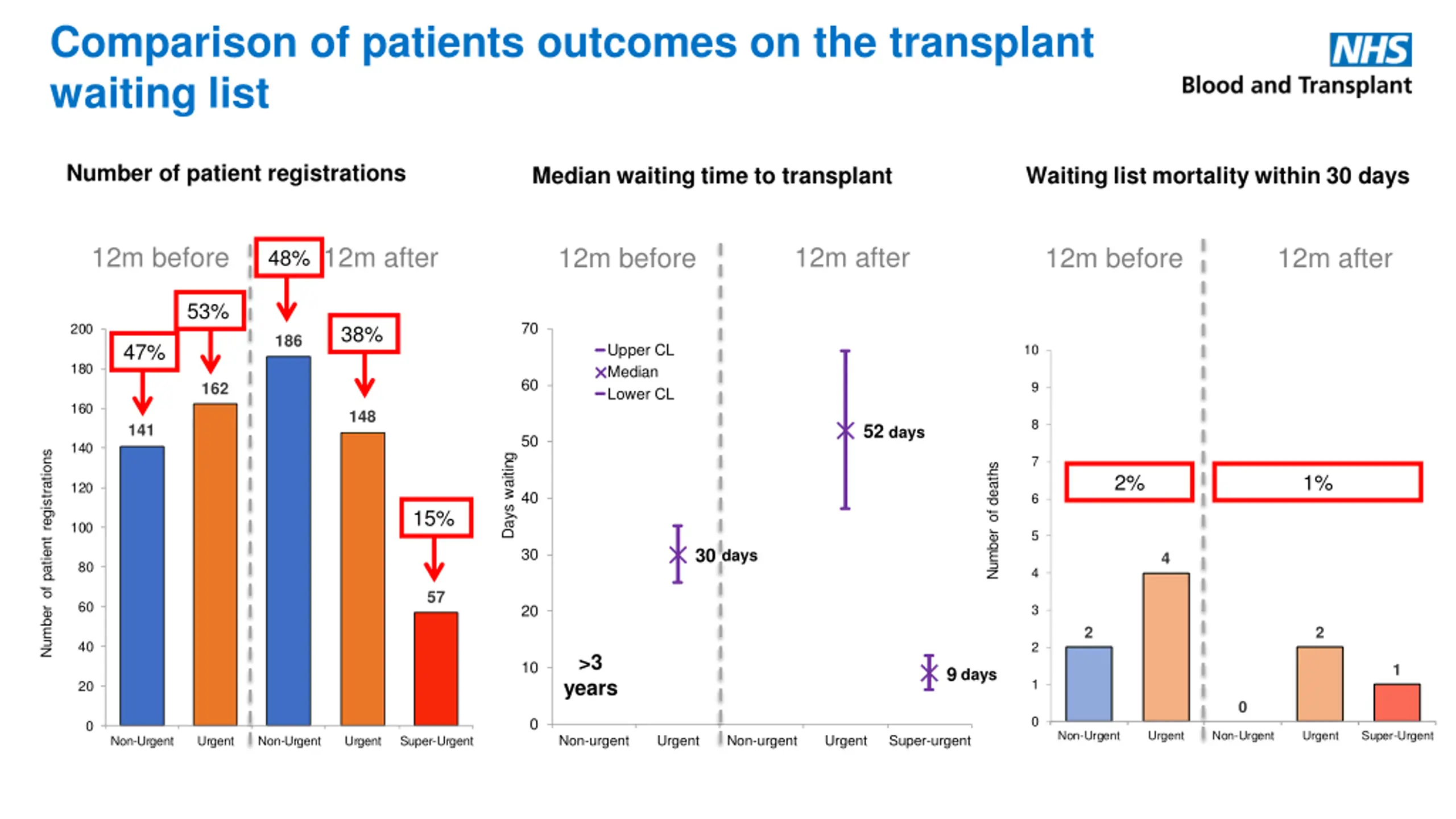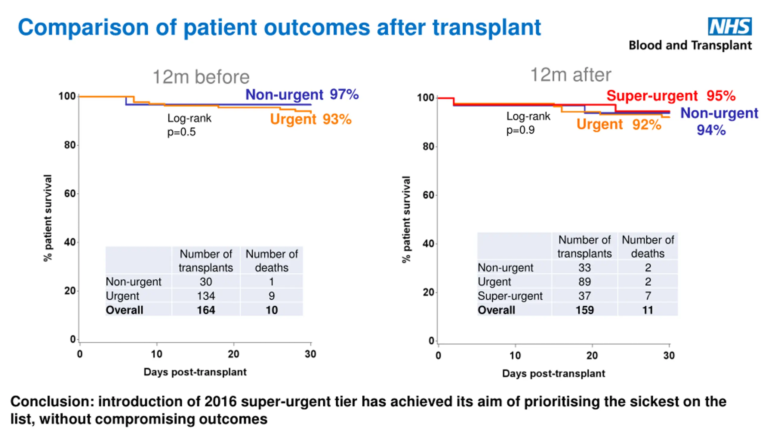 Comparison of patient outcomes after transplant 12m after 12m before 97% Non-urgent Super-urgent 95% Non-urgent 94% Log-rank p=0.9 Urgent 93% Log-rank p=0.5 Urgent 92% Number of transplants 33 89 37 159 Number of deaths 2 2 7 11 Number of transplants 30 134 164 Number of deaths 1 9 10 Non-urgent Urgent Super-urgent Overall Non-urgent Urgent Overall Conclusion: introduction of 2016 super-urgent tier has achieved its aim of prioritising the sickest on the list, without compromising outcomes