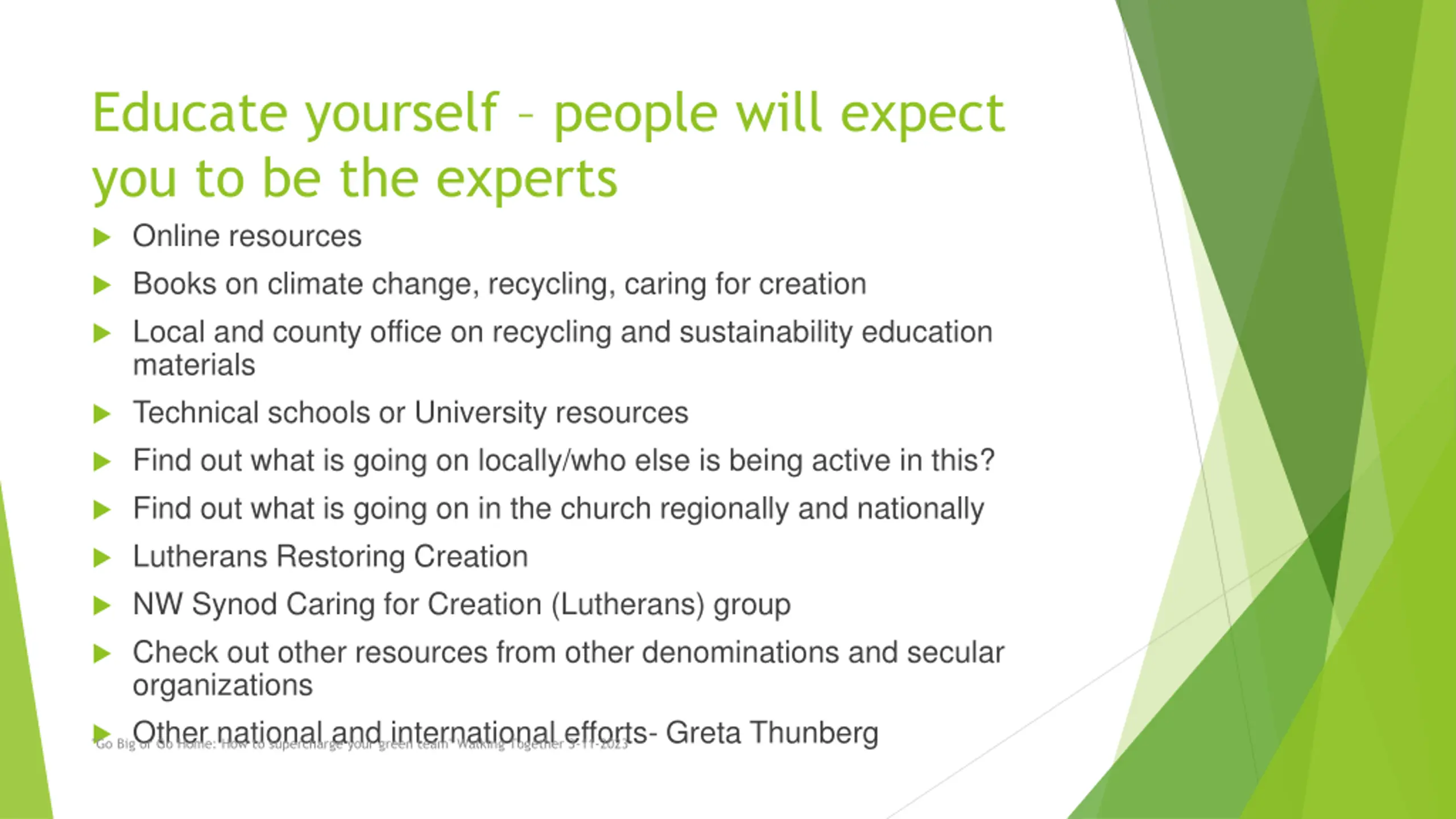 Educate yourself people will expect you to be the experts Online resources Books on climate change, recycling, caring for creation Local and county office on recycling and sustainability education materials Technical schools or University resources Find out what is going on locally/who else is being active in this? Find out what is going on in the church regionally and nationally Lutherans Restoring Creation NW Synod Caring for Creation (Lutherans) group Check out other resources from other denominations and secular organizations Other national and international efforts- Greta Thunberg "Go Big or Go Home: How to supercharge your green team" Walking Together 3-11-2023