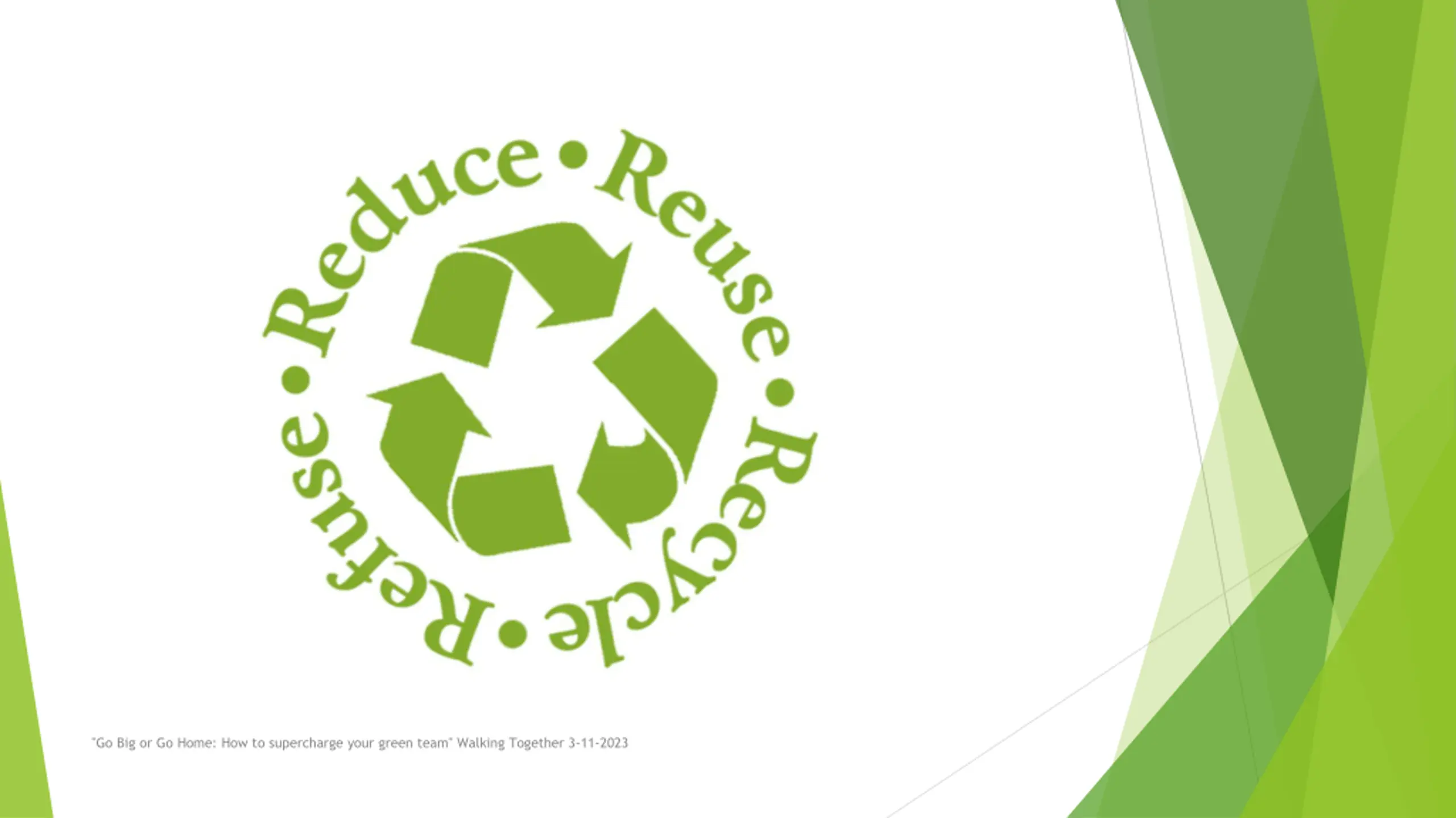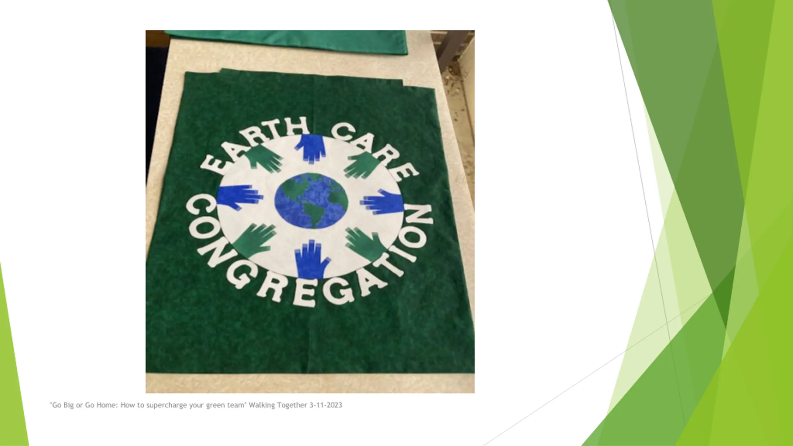 Other project possibilities Write a regular green information item(s) for the newsletter or bulletin Community garden Solar panels for the church Shop locally promotion Display of sustainable products Green techniques for church lawn care- delayed mowing for pollinators Displays of locally recyclable items- what to recycle and how Reduce use of plastic single use plastic bags/use of reusable shopping bags "Go Big or Go Home: How to supercharge your green team" Walking Together 3-11-2023