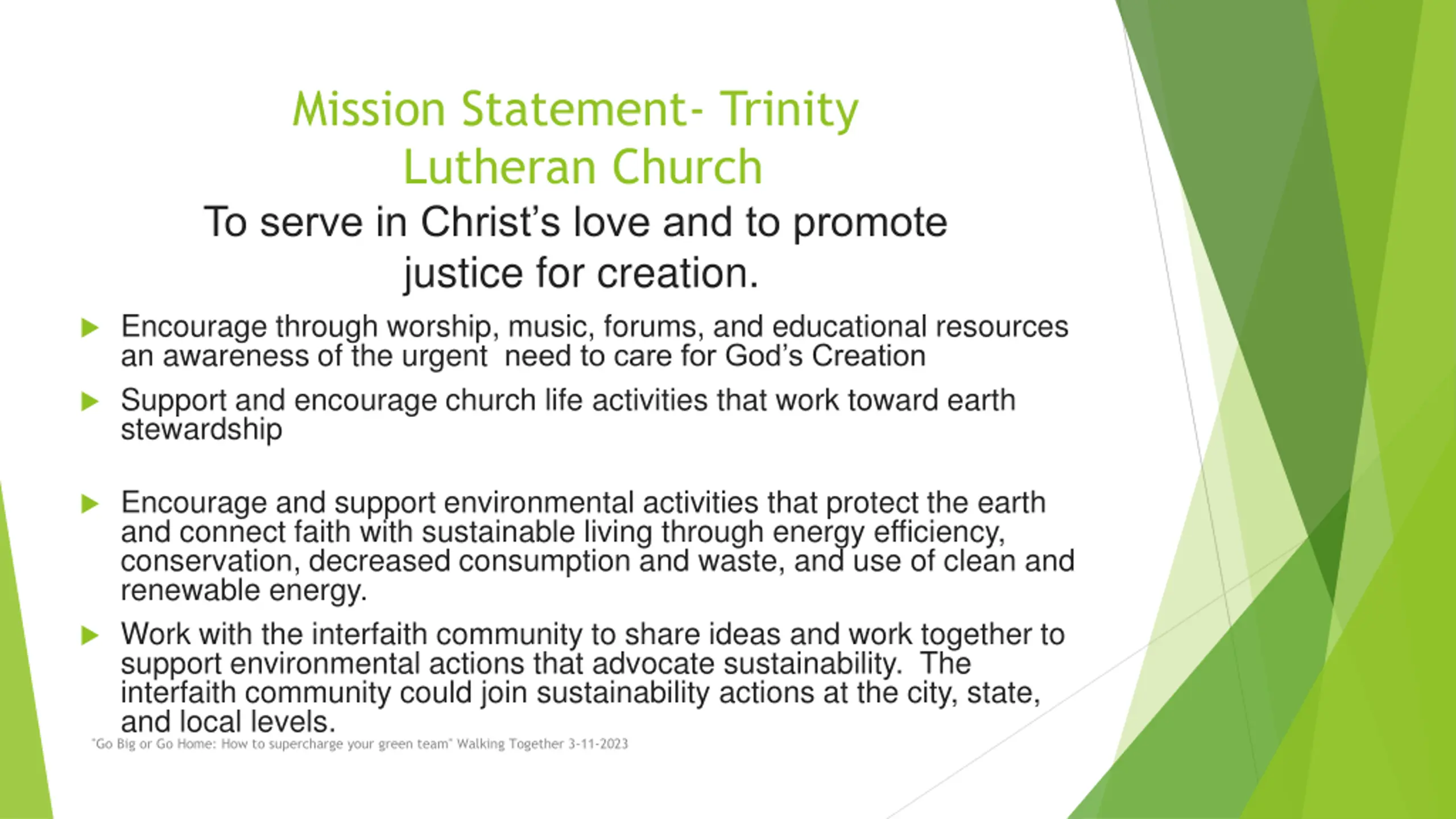 Mission Statement- Trinity Lutheran Church To serve in Christ s love and to promote justice for creation. Encourage through worship, music, forums, and educational resources an awareness of the urgent need to care for God s Creation Support and encourage church life activities that work toward earth stewardship Encourage and support environmental activities that protect the earth and connect faith with sustainable living through energy efficiency, conservation, decreased consumption and waste, and use of clean and renewable energy. Work with the interfaith community to share ideas and work together to support environmental actions that advocate sustainability. The interfaith community could join sustainability actions at the city, state, and local levels. "Go Big or Go Home: How to supercharge your green team" Walking Together 3-11-2023