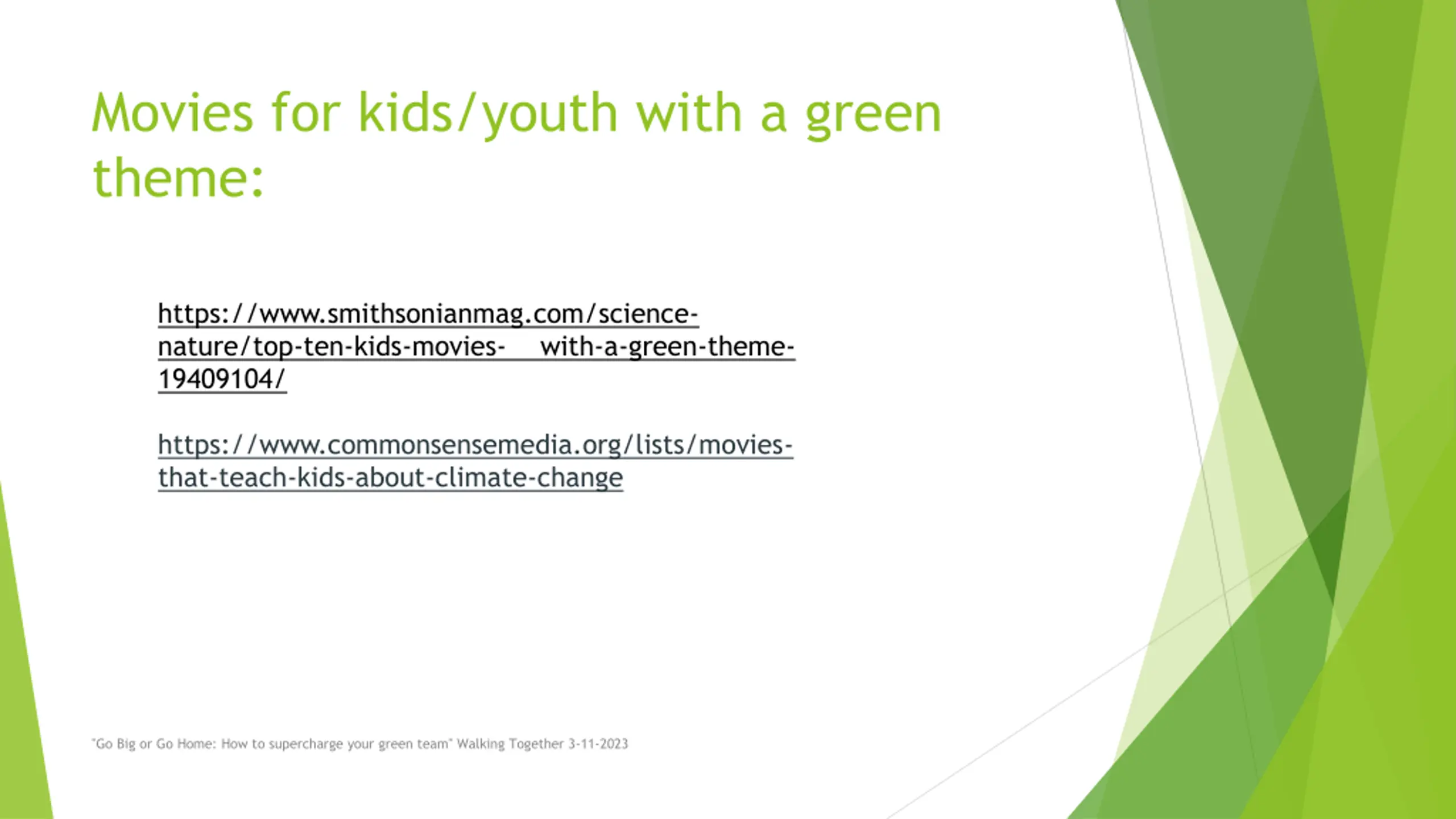 Movies for kids/youth with a green theme: https://www.smithsonianmag.com/science- nature/top-ten-kids-movies- 19409104/ with-a-green-theme- https://www.commonsensemedia.org/lists/movies- that-teach-kids-about-climate-change "Go Big or Go Home: How to supercharge your green team" Walking Together 3-11-2023