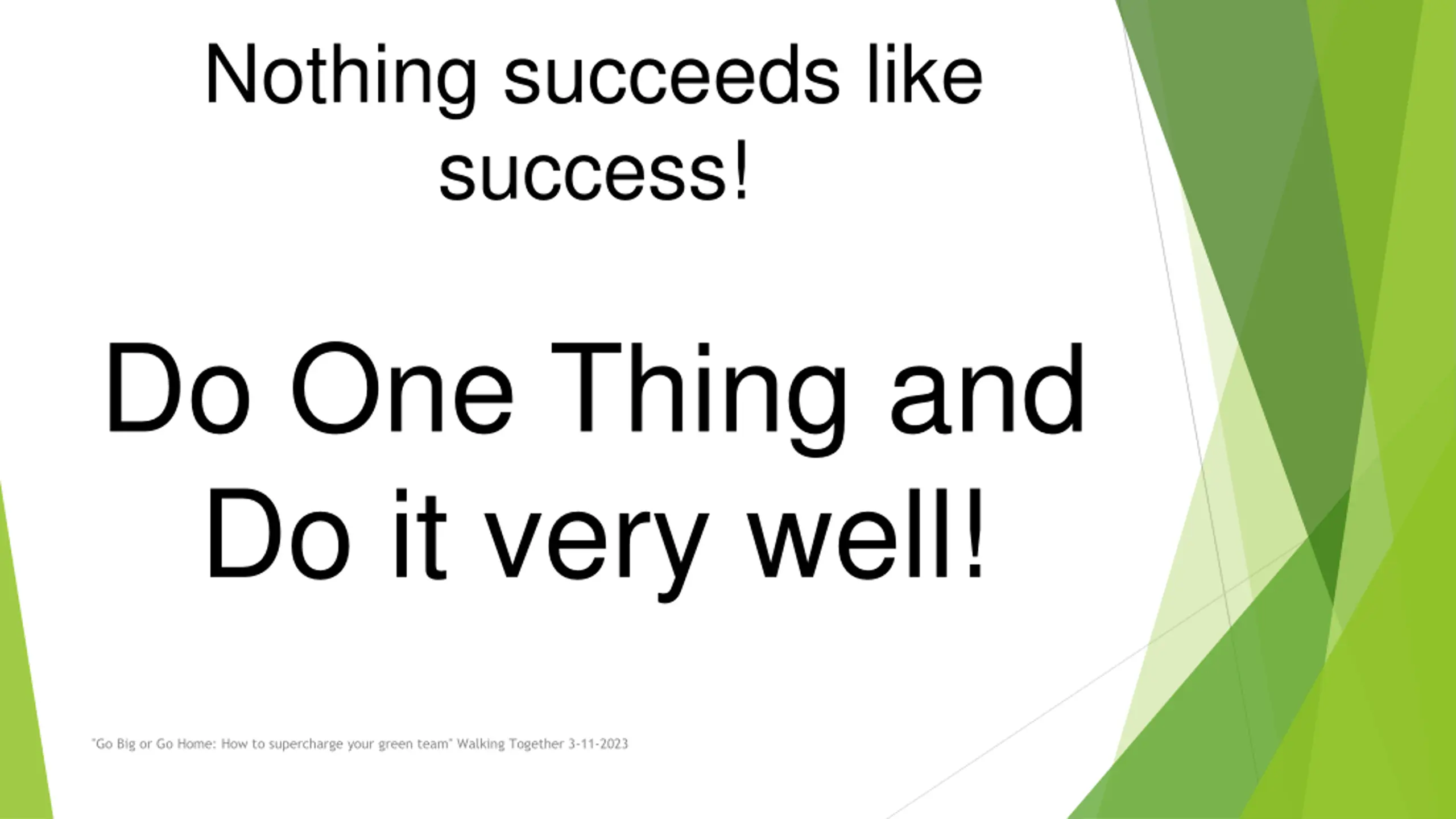 Nothing succeeds like success! Do One Thing and Do it very well! "Go Big or Go Home: How to supercharge your green team" Walking Together 3-11-2023