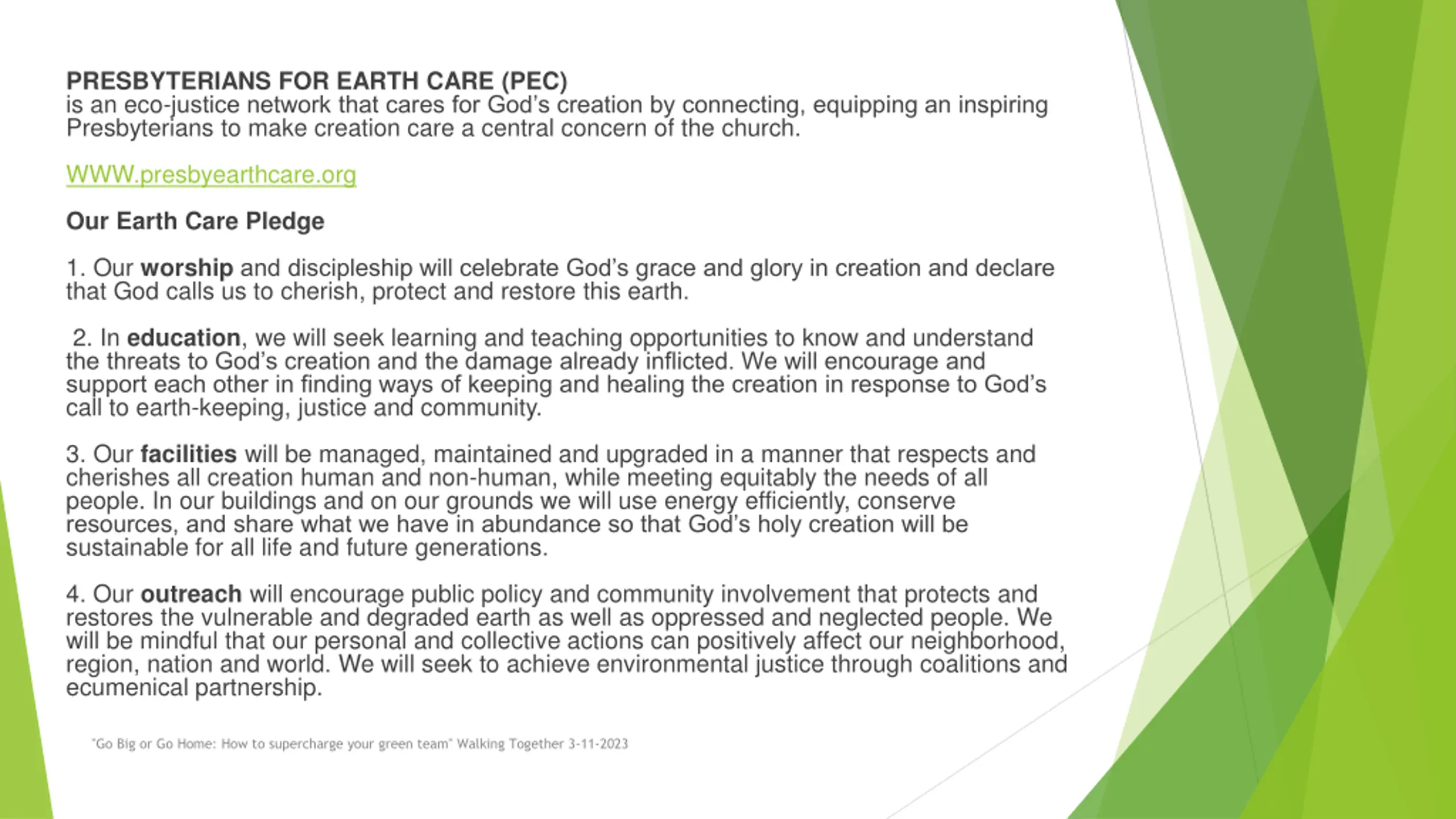 PRESBYTERIANS FOR EARTH CARE (PEC) is an eco-justice network that cares for God s creation by connecting, equipping an inspiring Presbyterians to make creation care a central concern of the church. WWW.presbyearthcare.org Our Earth Care Pledge 1. Our worshipand discipleship will celebrate God s grace and glory in creation and declare that God calls us to cherish, protect and restore this earth. 2. In education, we will seek learning and teaching opportunities to know and understand the threats to God s creation and the damage already inflicted. We will encourage and support each other in finding ways of keeping and healing the creation in response to God s call to earth-keeping, justice and community. 3. Our facilities will be managed, maintained and upgraded in a manner that respects and cherishes all creation human and non-human, while meeting equitably the needs of all people. In our buildings and on our grounds we will use energy efficiently, conserve resources, and share what we have in abundance so that God s holy creation will be sustainable for all life and future generations. 4. Our outreach will encourage public policy and community involvement that protects and restores the vulnerable and degraded earth as well as oppressed and neglected people. We will be mindful that our personal and collective actions can positively affect our neighborhood, region, nation and world. We will seek to achieve environmental justice through coalitions and ecumenical partnership. "Go Big or Go Home: How to supercharge your green team" Walking Together 3-11-2023