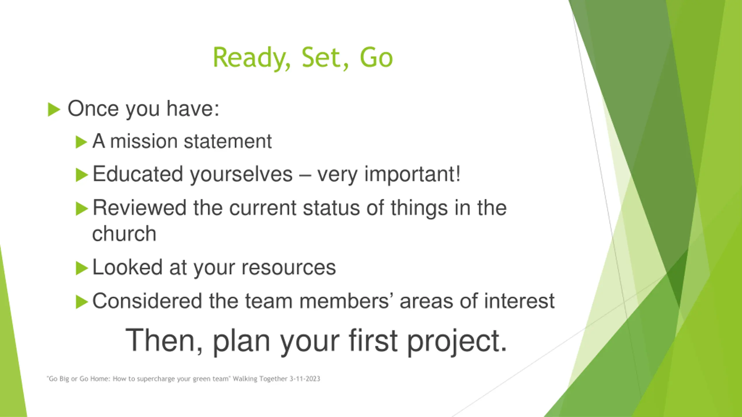 Ready, Set, Go Once you have: A mission statement Educated yourselves very important! Reviewed the current status of things in the church Looked at your resources Considered the team members areas of interest Then, plan your first project. "Go Big or Go Home: How to supercharge your green team" Walking Together 3-11-2023